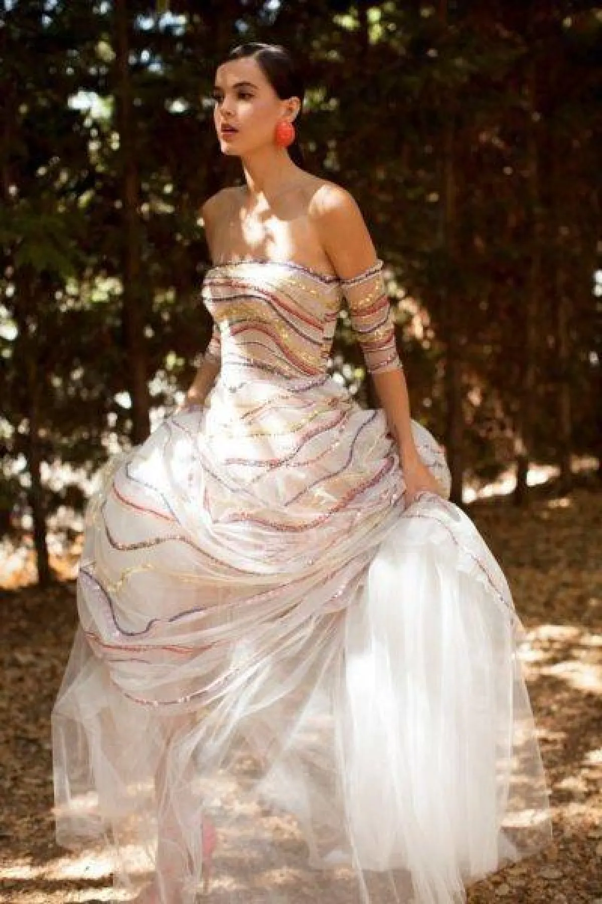 وتزينت بعض الفساتين بالخيوط الملونة التي تمنحها لمسة نابضة بالحيوية.
