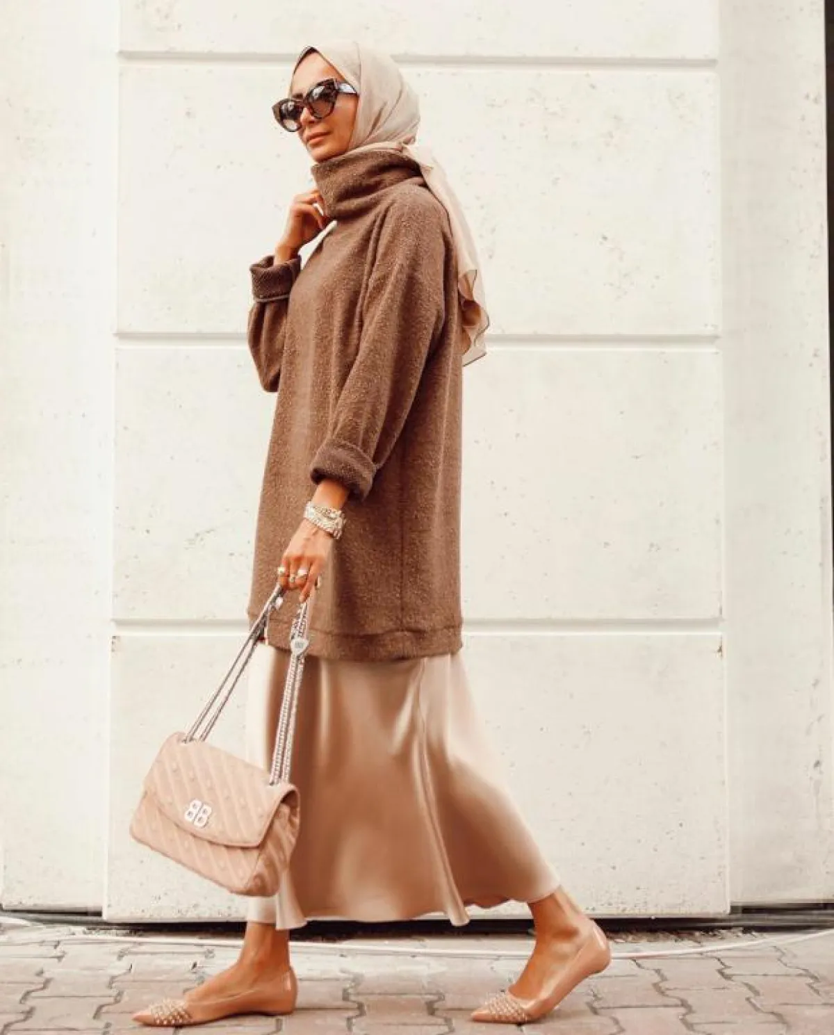 لا تترددي في إعتماد إطلالات أحادية اللون هذا الخريف لأنها من أبرز الصيحات الدارجة كما أنها ستؤمن لكِ المزيد من الطول، نسقي التنورة البليسيه مع كنزة صوف طويلة وطرحة بيج وزيني اللوك بوشاح برغندي طويل، كما يمكنك تنسيق سويت شيرت جملي طويل مع تنورة ساتان وحذاء وحقيبة بلون الجلد.