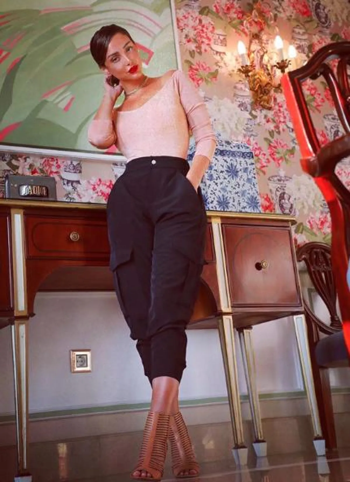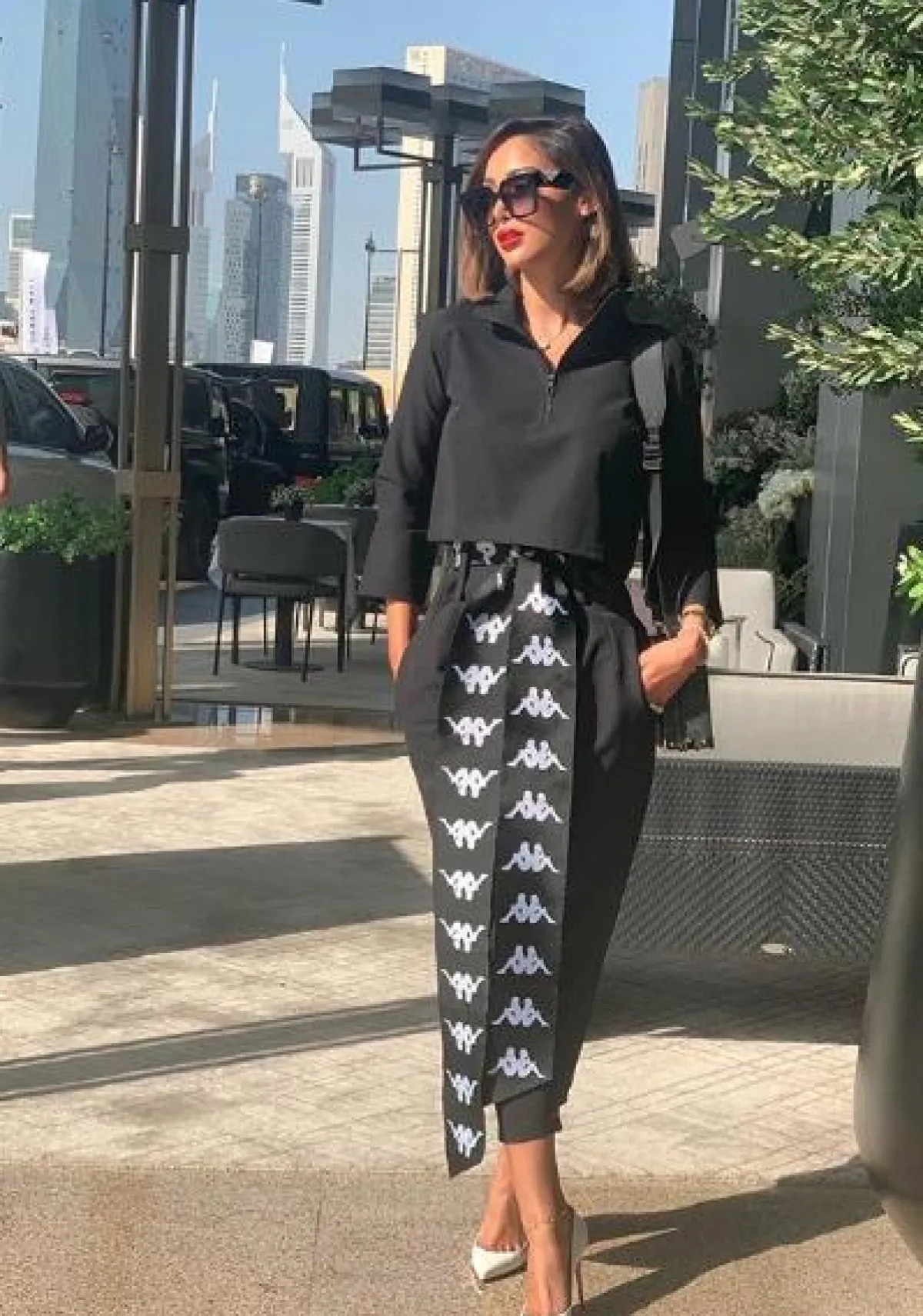 تنسيق أنيق باللون الأسود شاهدنا به بسمة بوسيل، جمعت فيه بين الأناقة والعصرية، حيث نسقت بنطلونًا أسود بقصة أرجل واسعة، زينت خصره بحزام قماشي باللونين الأسود والأبيض من كابا Kappa مع قميص قصير ذي طابع رياضي، وأكملت اللوك بحذاء بكعب عالٍ أبيض من كريستيان لوبوتان Christian Louboutin، وحقيبة كتف شبابي من لويس فويتون Louis Vuitton.