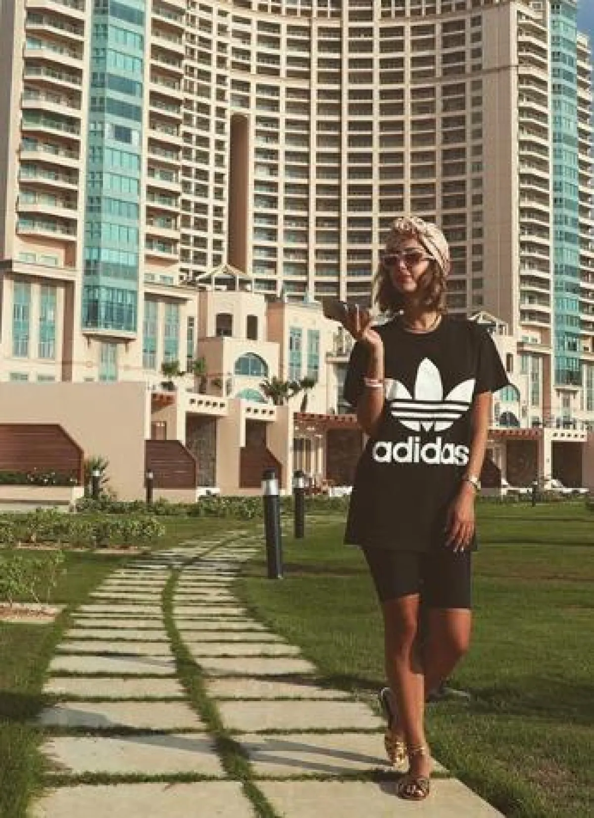 شاهدنا بسمة بوسيل في أحد المشاوير اليومية، وقد نسقت لوك عصريًّا وشبابيًّا مواكبًا لأحدث صيحات الموضة، وكان عبارة عن شورت أسود مطاطي نسقت معه توب قطنية بيضاء، ومن فوقها جاكيت رياضي من بالنسياغا Balenciaga وأكملت اللوك بشنطة يد من لويس فويتون Louis Vuitton وحذاء باللون الأحمر ونظارات شمسية شبابية.