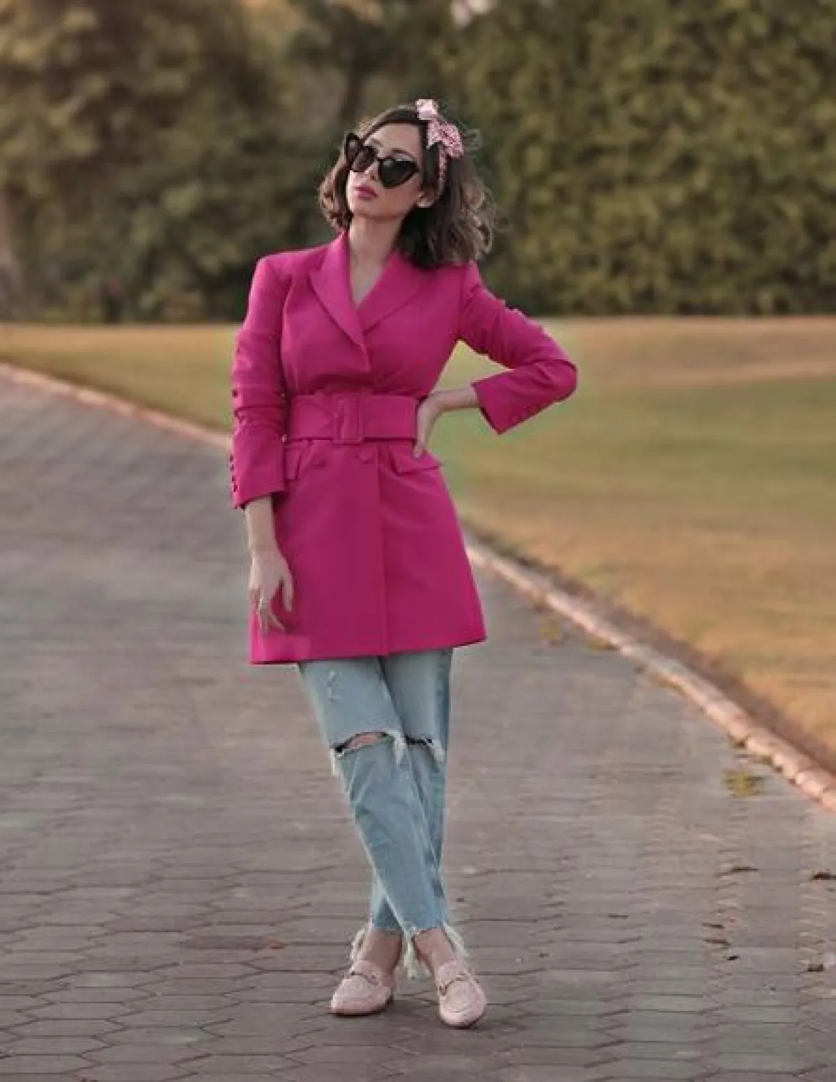 اطلالة أُخرى سبور نسقتها بسمة بوسيل، لكن هذه المرة بدا التنسيق غير موفق، حيث إنها اختارت بنطلون جينز ممزقًا، نسقت معه بليزر طويل باللون الفوشيا، وحذاءً من دون كعب باللون الزهري من غوتشي Gucci، وأكملت اللوك بنظارات شمسية على شكل قلوب، وزينت شعرها باكسسوار بناتي على شكل شريطة وقد بدا اللوك مبهرجًا وطفوليًّا.