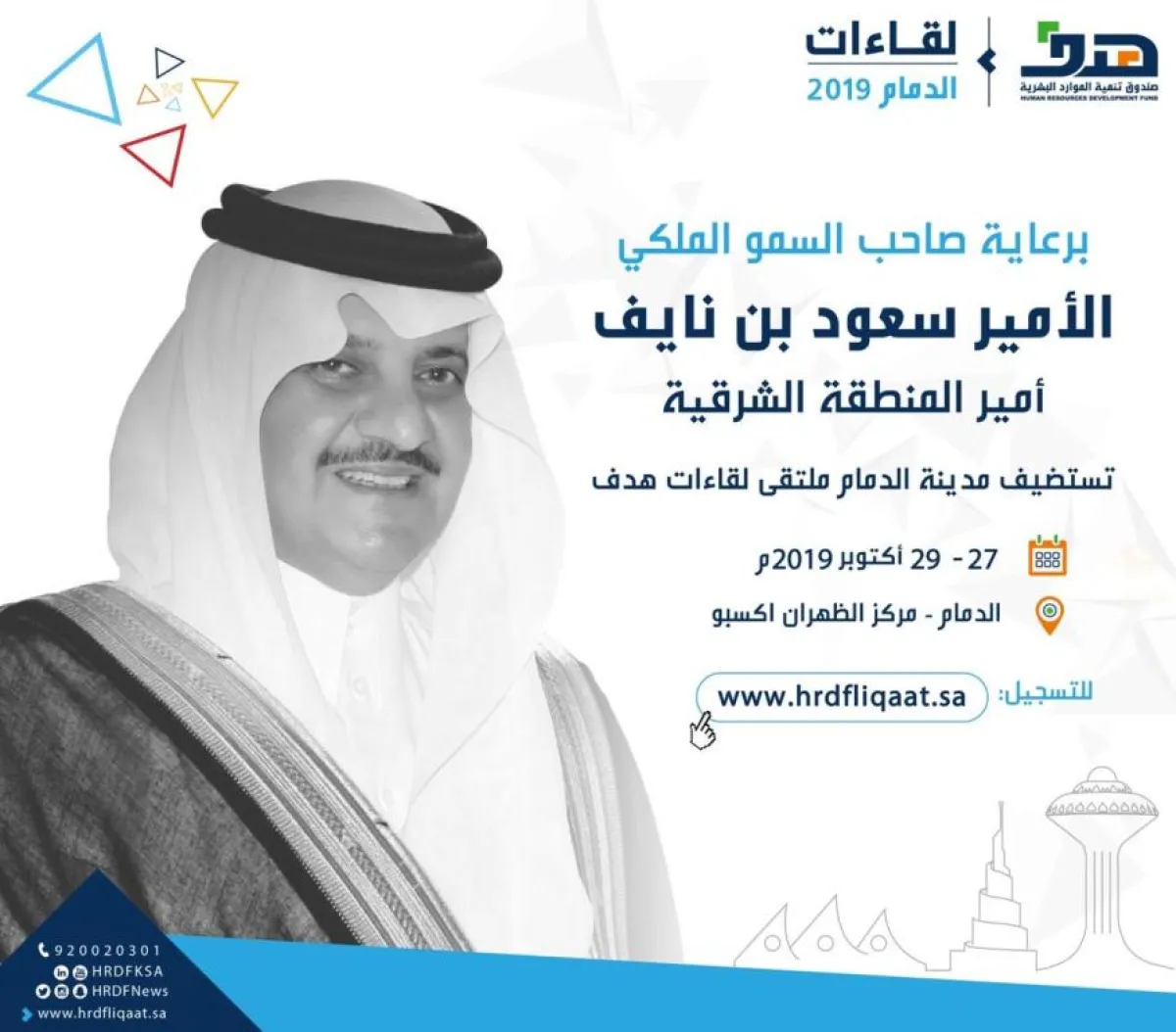ودعا "هدف"، بفرعه في المنطقة الشرقية، جميعَ المستفيدين للتسجيل إلكترونيًّا في ملتقى لقاءات "هدف" في الدمام، عبر الرابط: https://hrdfliqaat.sa ؛ من أجل الاستفادة من برامج وممكنات دعم التأهيل والتدريب والتوظيف التي يحتضنها الملتقى.