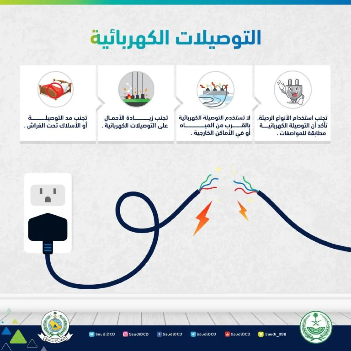 وجه الدفاع المدني عبر حسابه الرسمي على موقع التواصل الاجتماعي "تويتر"، عدداً من الإرشادات الهامة تتعلق بالتوصيلات الكهربائية، يجب مراعاتها من أجل سلامة المستهلكين.