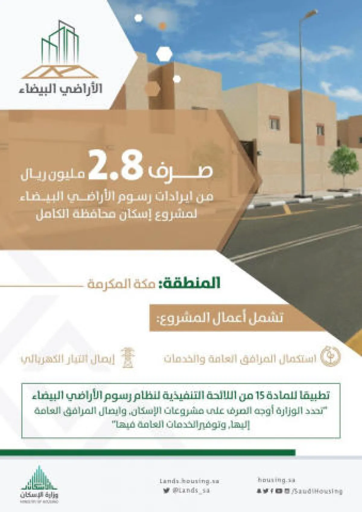 وأوضح البرنامج ، أن المادة الـ ١٥ من اللائحة التنفيذية لرسوم الأراضي البيضاء تنص على أن المبالغ التي يتم تحصيلها تصرف لتطوير مشاريع البنية التحتية وفق النص الآتي: "تحدد الوزارة أوجه الصرف ـــ من الحساب الخاص بمبالغ الرسوم والغرامات المحصلة ـــ على مشروعات الإسكان، وإيصال المرافق العامة إليها وتوفير الخدمات العامة فيها".