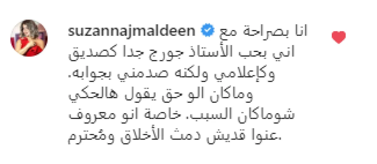وقالت النجمة السورية سوزان نجم الدين: انا بصراحة مع اني بحب الأستاذ جورج جدا كصديق وكإعلامي ولكنه صدمني بجوابه. وماكان الو حق يقول هالحكي شوماكان السبب. خاصة انو معروف عنوا قديش دمث الأخلاق ومُحترم.