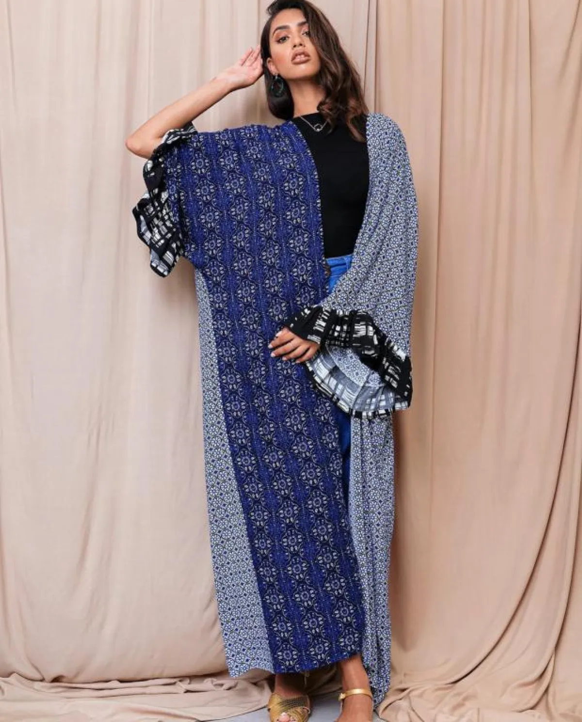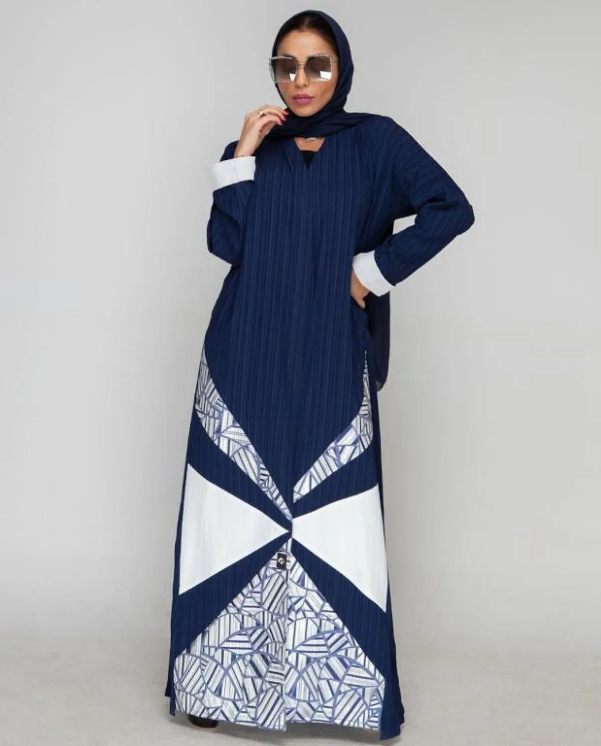 ضمت مجموعات 2019 لأشهر الماركات عبايات زرقاء مطبعة، بعضها غُلّف بالكامل بالنقوشات كما في تصميم ماركة Aywa London وتناسب النحيفات، فيما قُدّمت موديلات أخرى بطبعات حول منطقة الأفخاذ والساقين مثل تصميم Leenaz، Haal وMemash ونرشحها لذوات القامة على شكل التفاحة، لتشتت النظر بعيدًا عن منطقتَيْ الصدر والبطن الممتلئتين.
