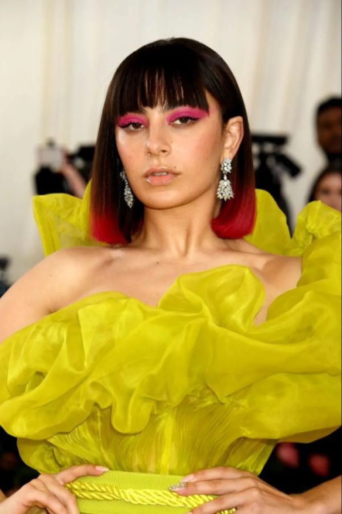 اختارت Charli XCX الكاريه المموج مع الغرة العريضة الخفيفة من الأطراف، واعتمدت صبغة اللون الأحمر فقط للأطراف، للمسة مختلفة، بدت متناغمة مع مكياج عيونها الفاقع.