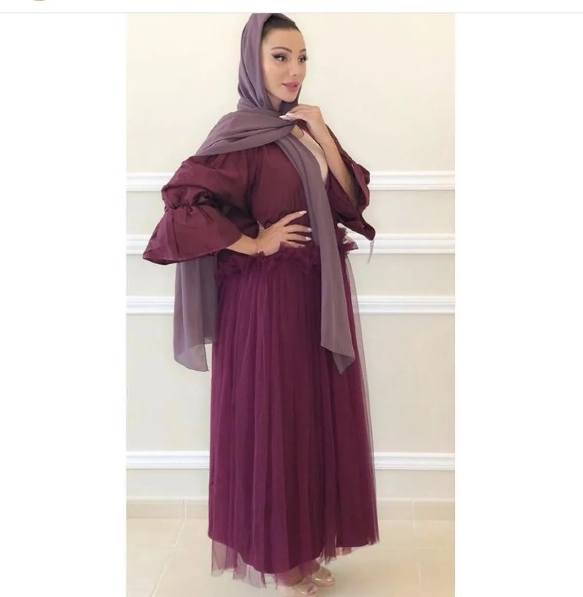 من الموديلات الشبابية للعبايه بهذا اللون، هذا التصميم من B Line من التول المنفوش، والأكمام الكشكشة الواسعة، مناسبة أكثر لأوقات ما بعد المساء، بخاصة للصبايا العشرينيات، يمكن معها أن ترتدي حذاء نود أو فضيًّا، وكلتش أبيض أو أسود، ليضيف لمسة أكثر أنوثة مع العباية..