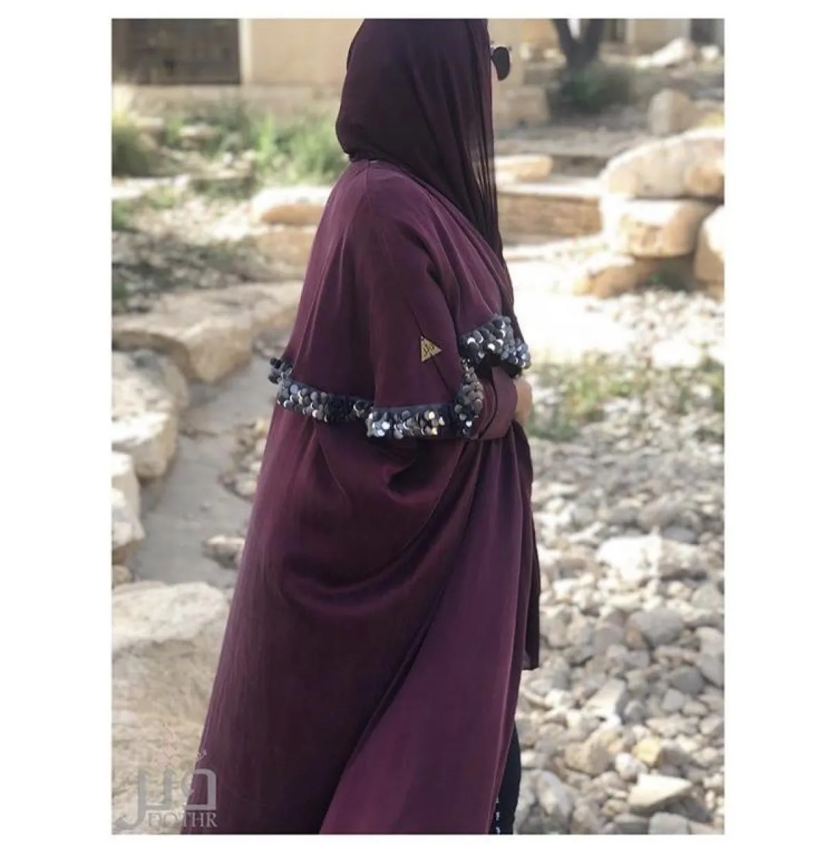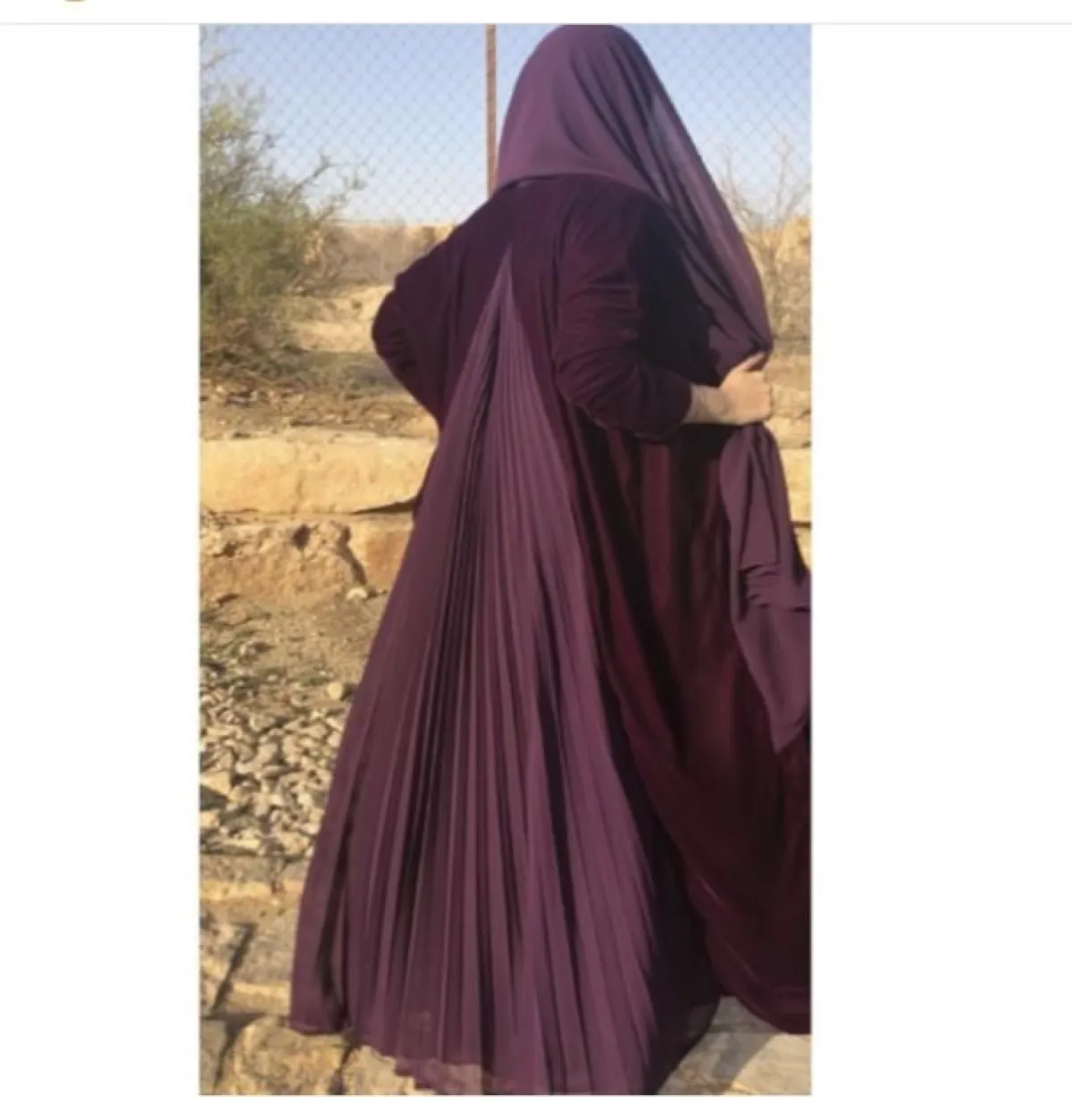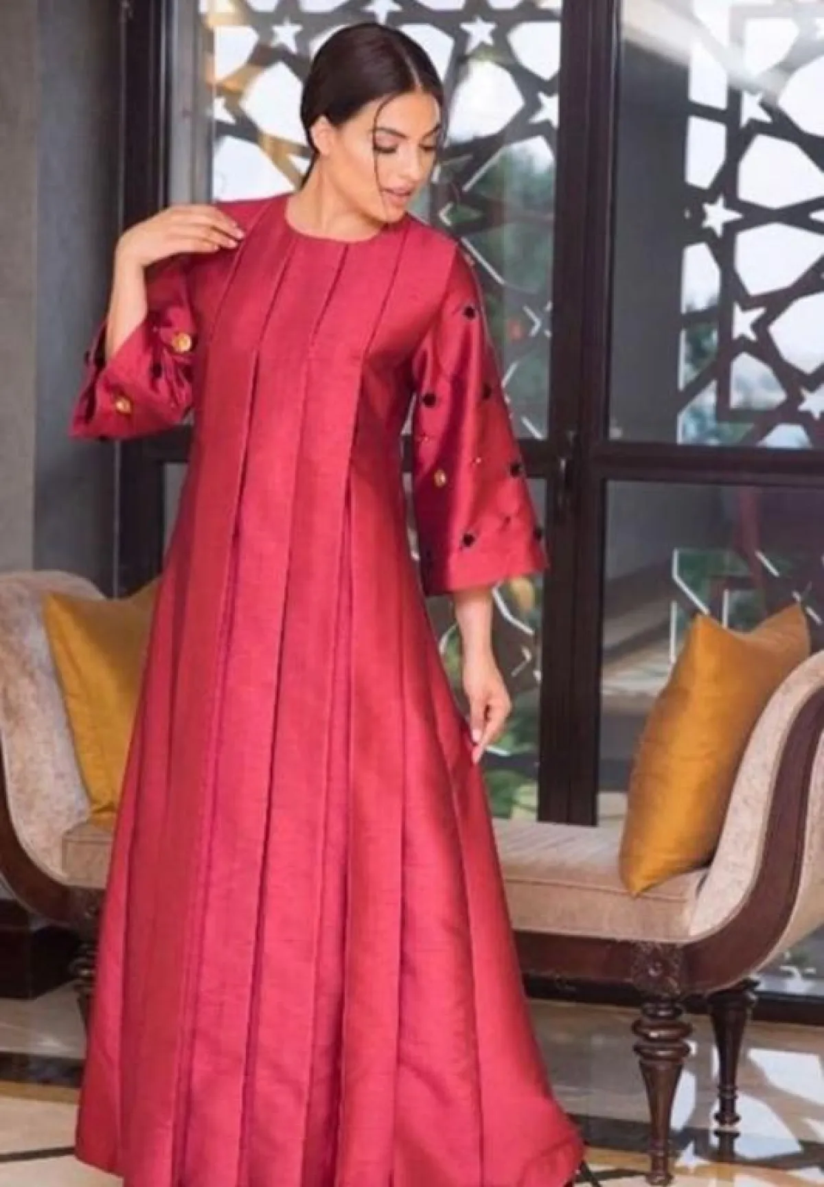 أما هذا التصميم من Khamila Sa للعبايه الفيلفت باللون الأحمر العنبي، بفتحة من كسرات البليسيه بتفاصيل الظهر آخر موضة، يمكنكِ اعتمادها هذا الموسم، لاطلالة عصرية، ونسقي معها حجابًا من اللون نفسه، وحذاءً أسود أو فضيًّا لسهراتِك.