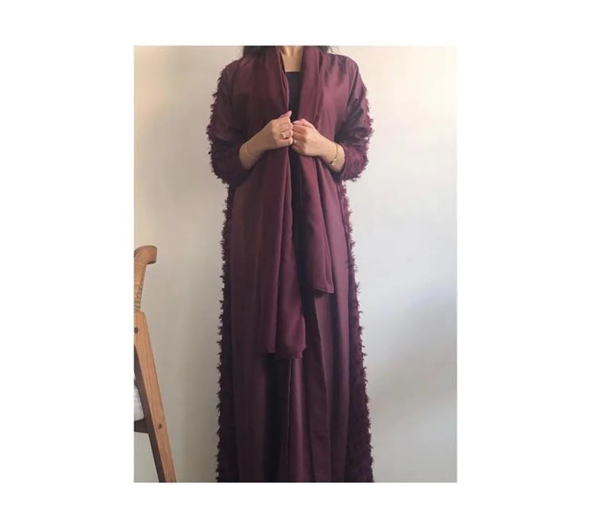 هذا الموديل من Yag Abaya للعبايه باللون الأحمر الداكن، بسيطة وناعمة جدًّا، ننصحكِ بأن تكون بخزانتكِ، لتمنحكِ أسلوبًا عصريًّا وجذابًا، بخاصة مع لمسات الريش على الأكمام وجانبي العبايه، مثالية للعمل ومشاويركِ النهارية، وتناسب كذلك كل أجسام الصبايا، فهي منسدلة وواسعة وتخفي عيوب القوام.