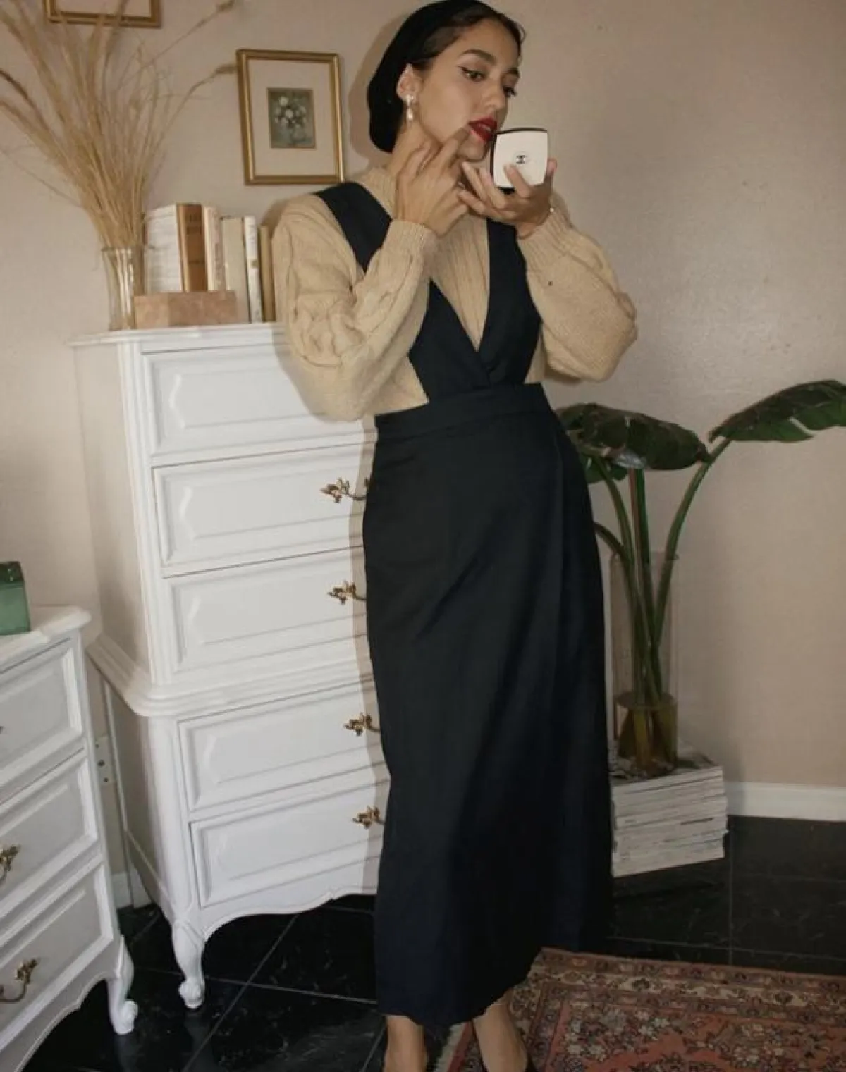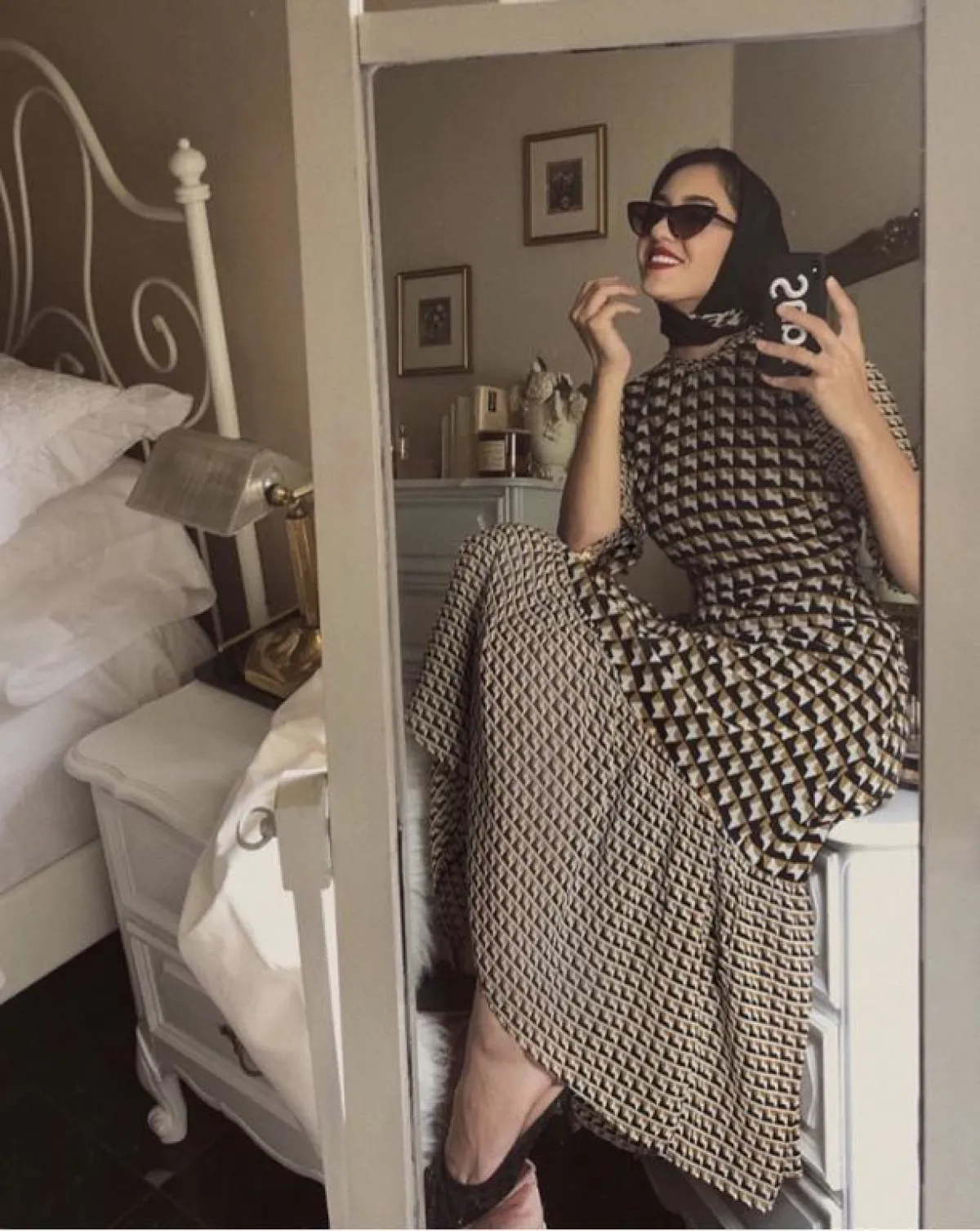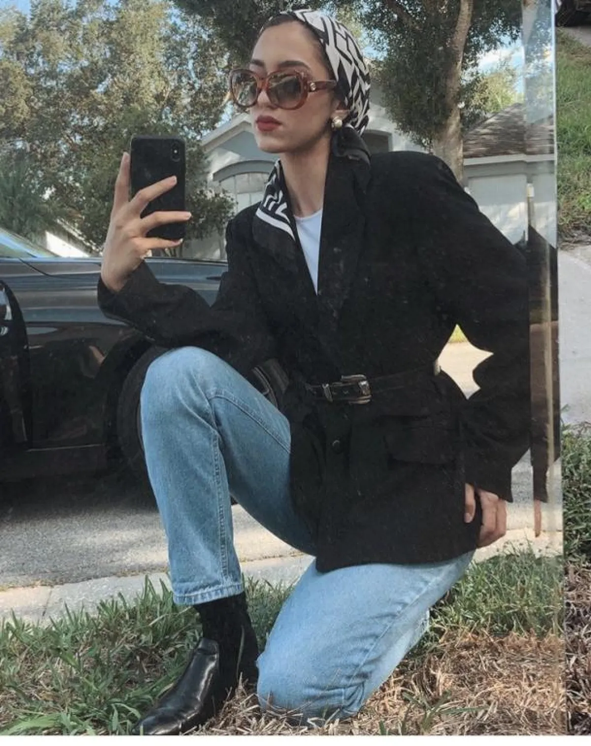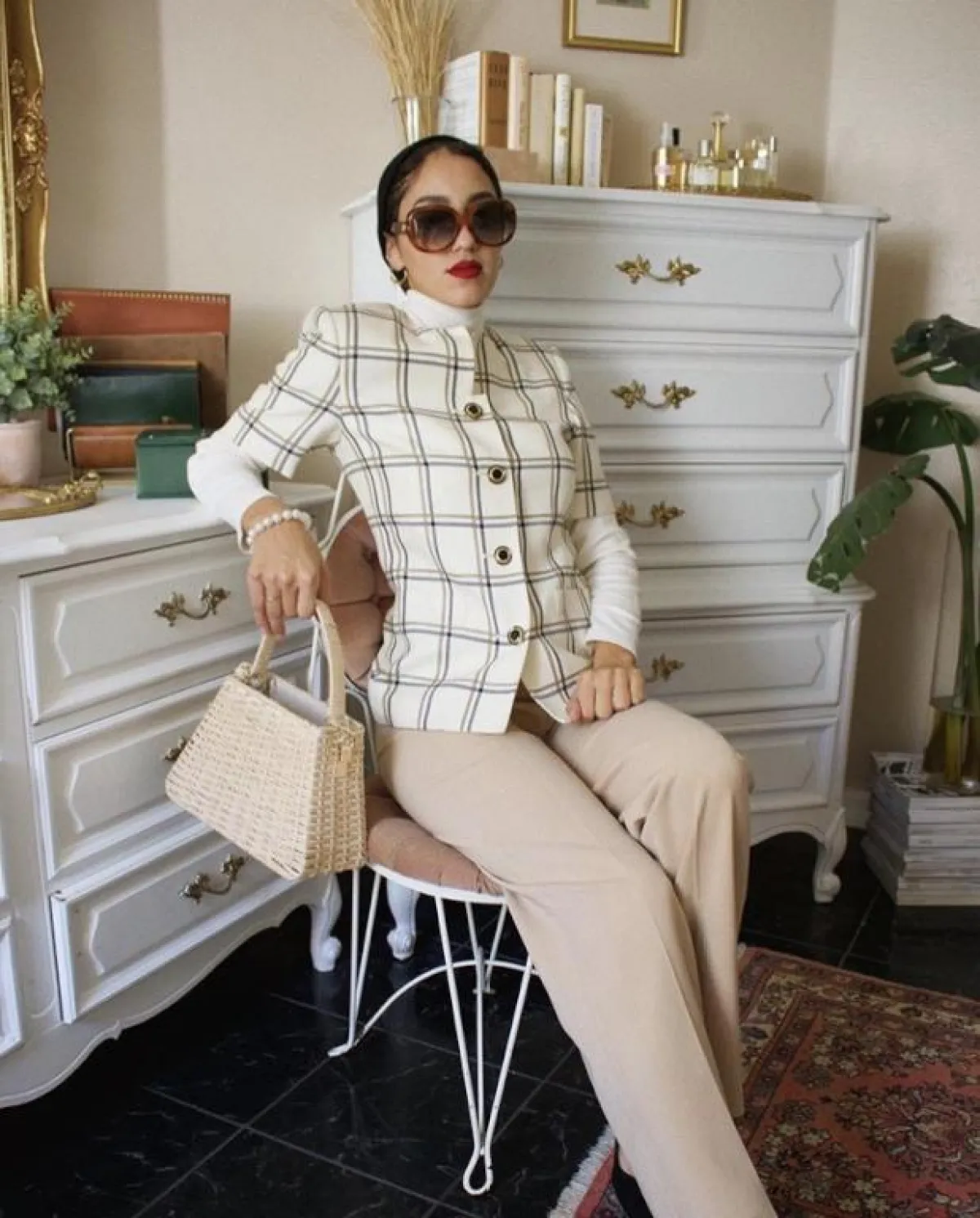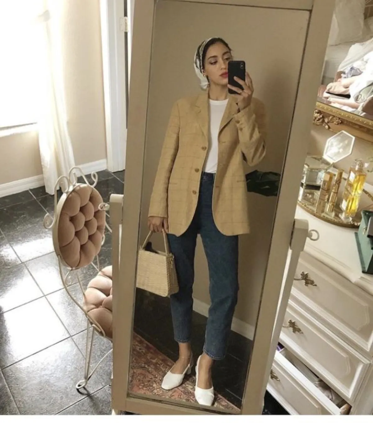 هذا اللوك أيضًا كاجوال وعصري، ولكن به لمسة كلاسيكية أنثوية، لصاحبات الذوق المخملي، يمكنكِ اعتماده طوال اليوم، سواء باطلالاتكِ النهارية أو المسائية، نسقته سالي بطريقة مميزة مع السكارف، لاطلالة مستوحاة من فترة الستينيات.