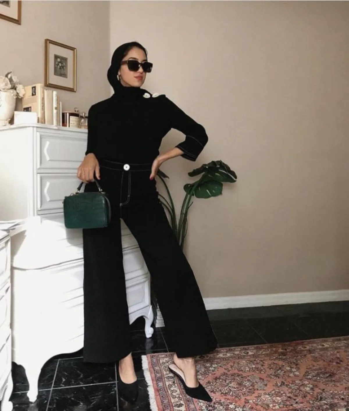 اختارت الفاشينيستا سالي عاشور بـ اطلالة محايدة باللون الأسود من بنطلون جينز عالي الخصر واسع، مع توب أسود، وحذاء الميول Mule، وسكارف مربوط للخلف، مع شنطة ميني صغيرة جلد.