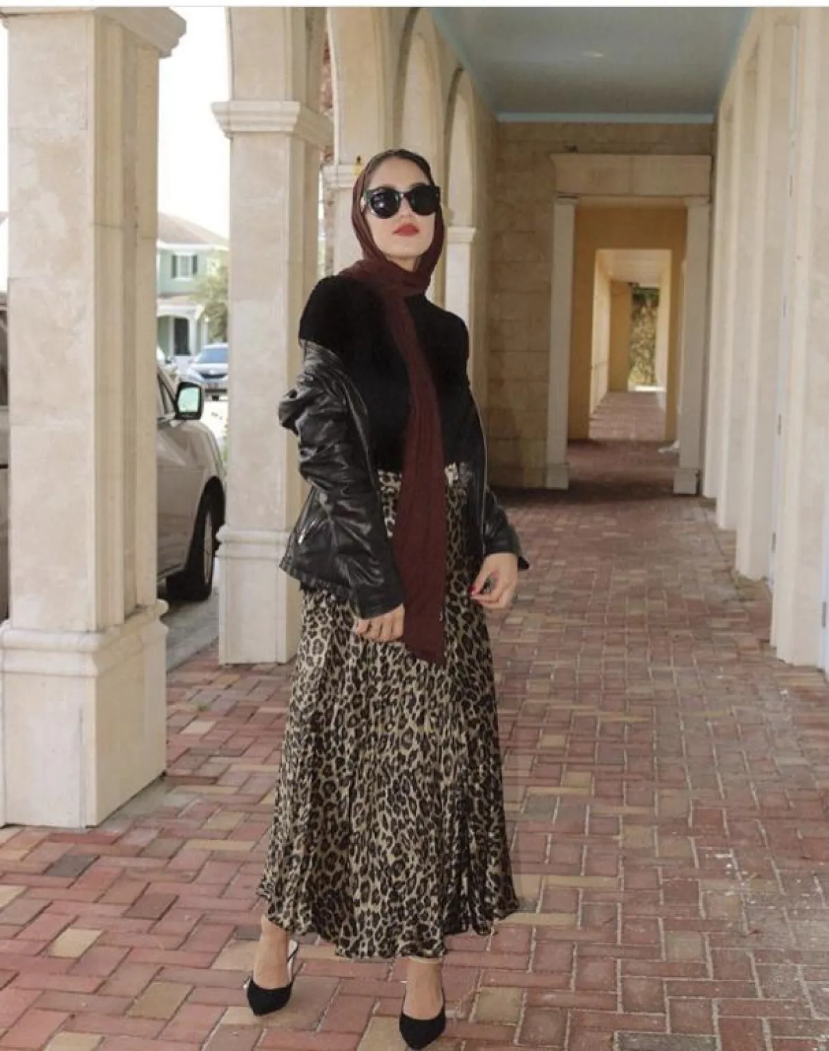 أعجبنا هذا اللوك من سالي عاشور للتنورة المطبعة بجلد النمر، مع الجاكيت الجلد والتوب الأسود، لاطلالة عملية وبالوقت نفسه غاية في الأناقة تلفتين بها الأنظار، بخاصة مع تنسيقها للحجاب باللون الأحمر العنبي.
