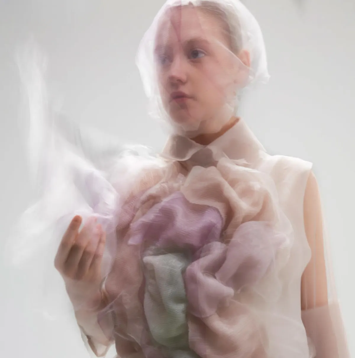 يتم تحقيق الأشكال المتغيرة باستخدام مواد قزحية الألوان ، ويتم إبرازها بواسطة الزجاج العاكس والسيليكون، ونسيج الأورغانزا خفيف الوزن.