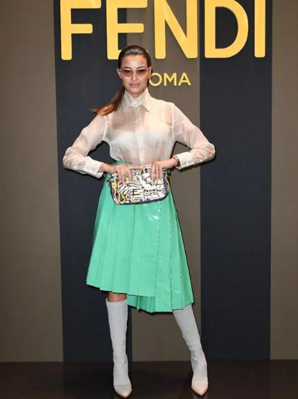 خلال أسبوع ميلانو للموضة، شاهدنا ريم سعيدي في عدد من الاطلالات المميزة التي ناسبت حملها في بدايت،ه منها هذا التنسيق اللافت من فندي Fendi والذي اعتمدت فيه تنورة ميدي من الجلد باللون الأخضر نسقت معها قميصا من الشيفون باللون البيج، وأكملت اللوك بجزمة عالية بيضاء وحقيبة كلاتش معرقة.