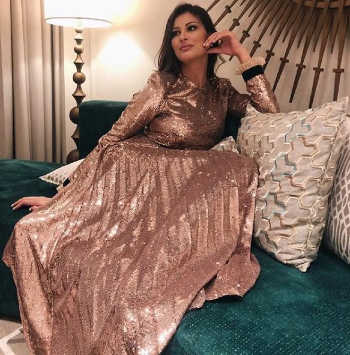 لوك أنثوي ناعم بدت فيه ريم سعيدي أنيقة خلال فترة الحمل، وكان عبارة عن فستان ميدي براق باللون الزهري، قصته منسدلة زينت خصره بحزام رفيع باللون الفضي، واختارت معه حقيبة كتف باللون البيج وحذاء بكعب عالٍ باللون الأبيض، وبعض الاكسسوارات الذهبية الناعمة.