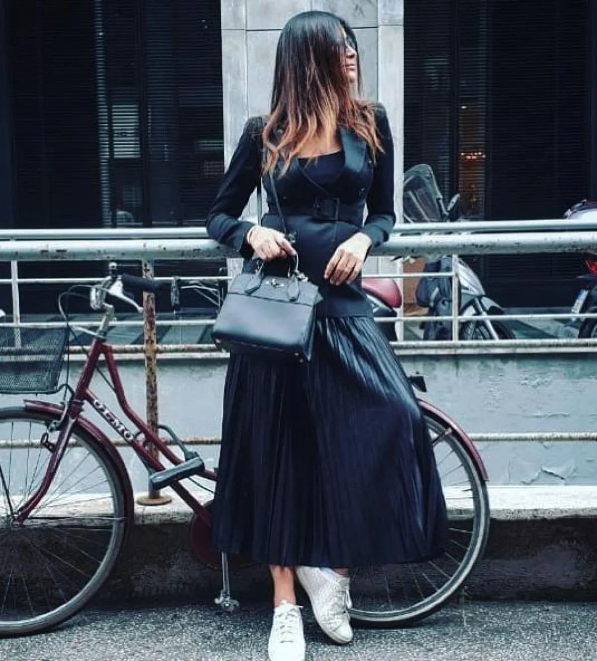 جميعنا نعرف قدرة اللون الأسود على إخفاء عيوب الجسم أو السمنة في مناطق معينة، وقد اعتدمت ريم سعيدي مؤخراً هذا اللون لإحدى إطلالاتها الصباحية، وقد نسقت جاكيت بليزر مع تنورة ماكسي بليسه طويلة وحقيبة يد من الجلد، وأكملت اللوك بحذاء رياضي أبيض أضافت من خلاله لمسات شبابية.