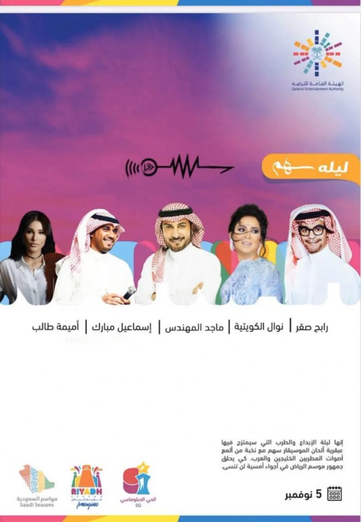 في 5 نوفمبر على مسرح فنان العرب محمد عبده بوليفيارد.. أنتم على موعد مع رابح صقر، ماجد المهندس، نوال الكويتية، أصالة نصري، إسماعيل مبارك، أميمة طالب.