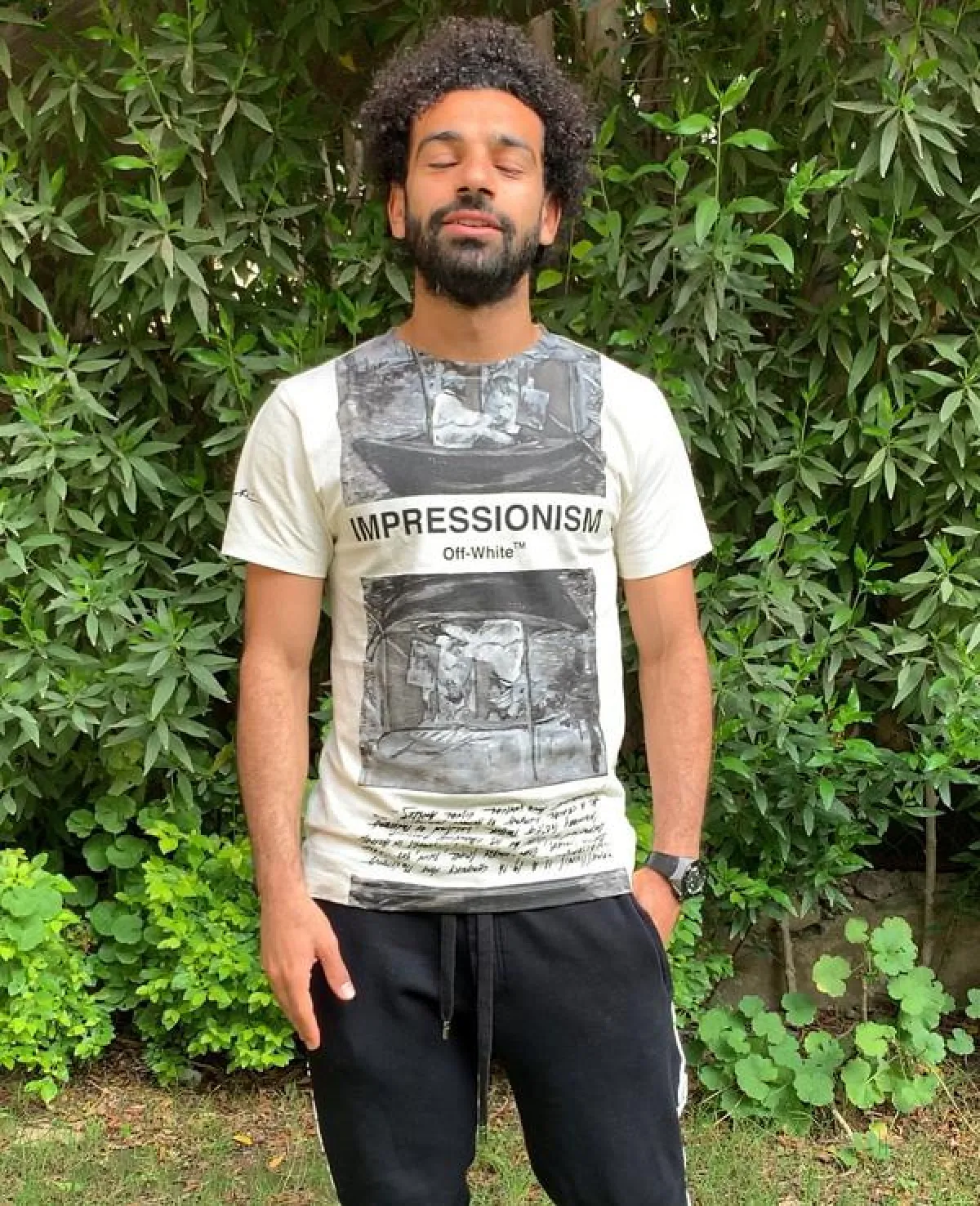وفي إطلالة ثانية، ارتدى محمد صلاح تيشيرت باللون الأسود مزينة بكتابات بيضاء اللون مع سترة رياضية باللون الأسود أيضاً وسروال رياضي من اللون نفسه.