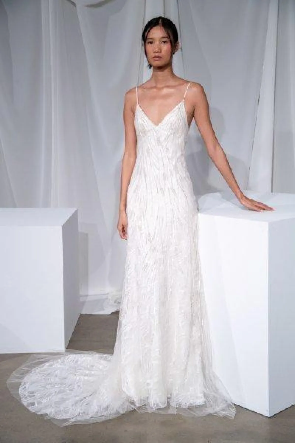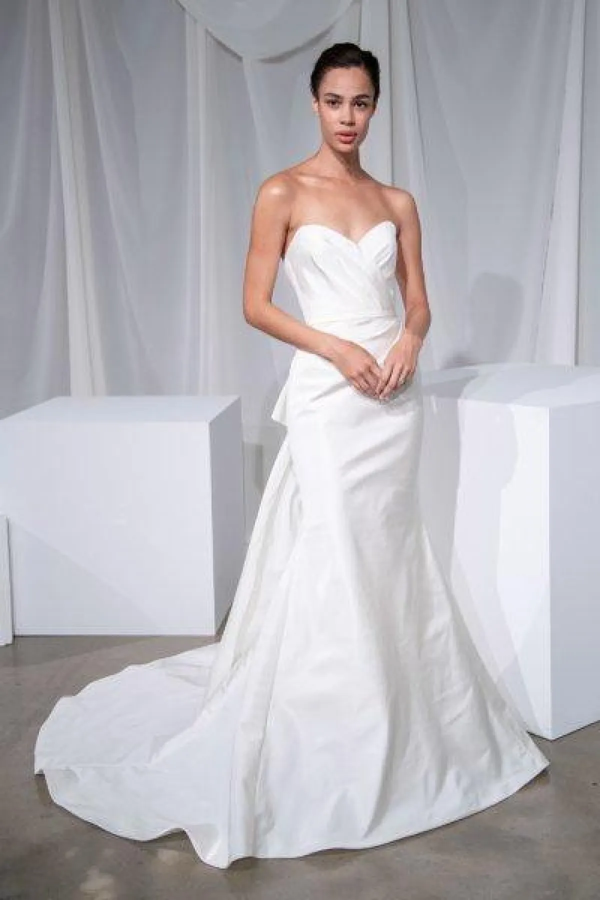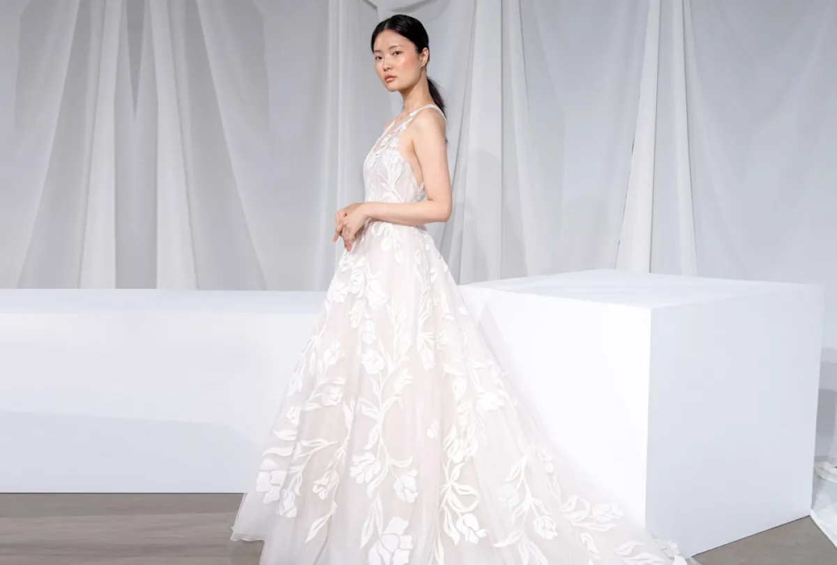 من ماركة Amsale، اخترنا لكِ فساتين زفاف ناعمة مع ذيل طويل، فقد غلبت القصّات العمودية والضيقة على التشكيلة.