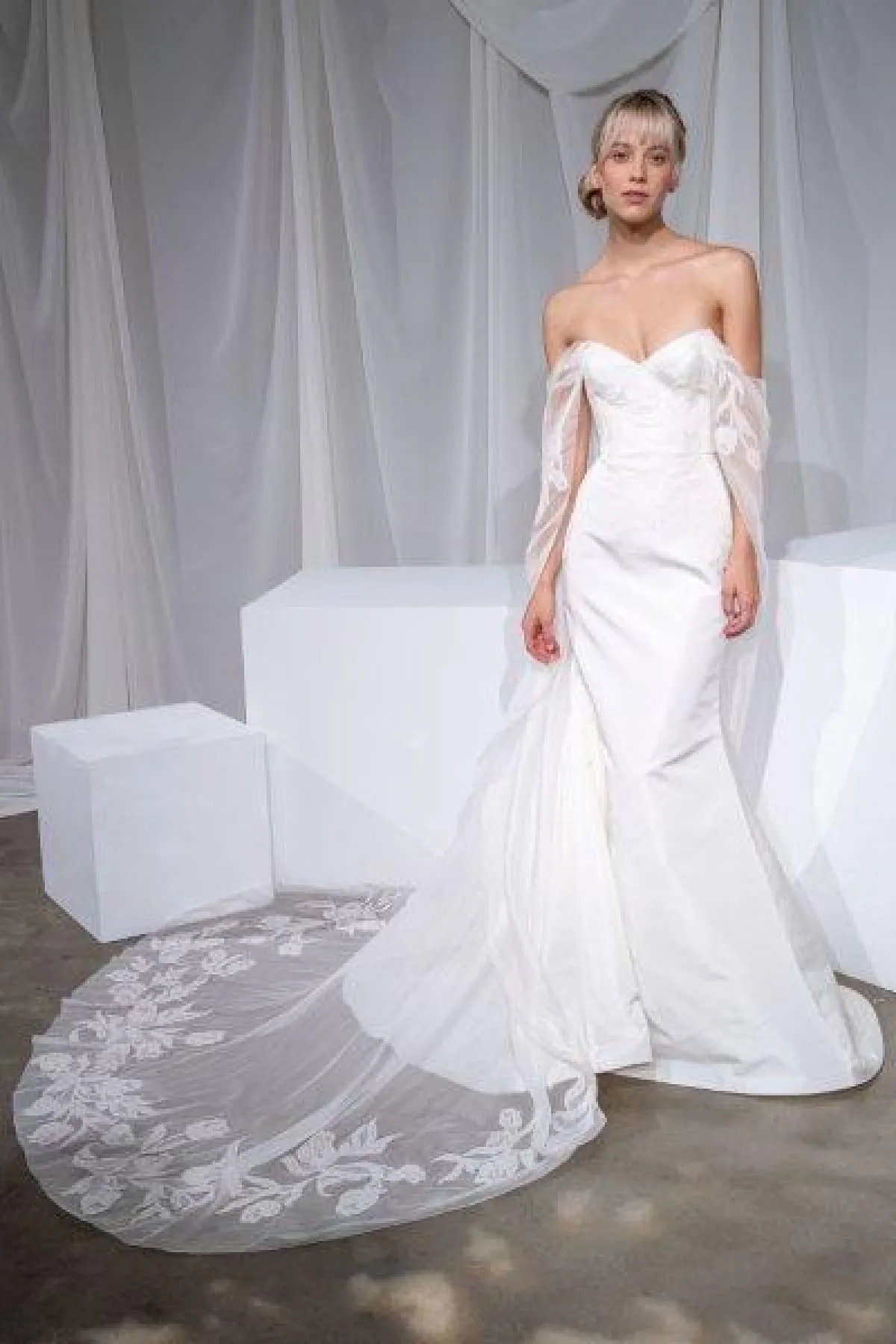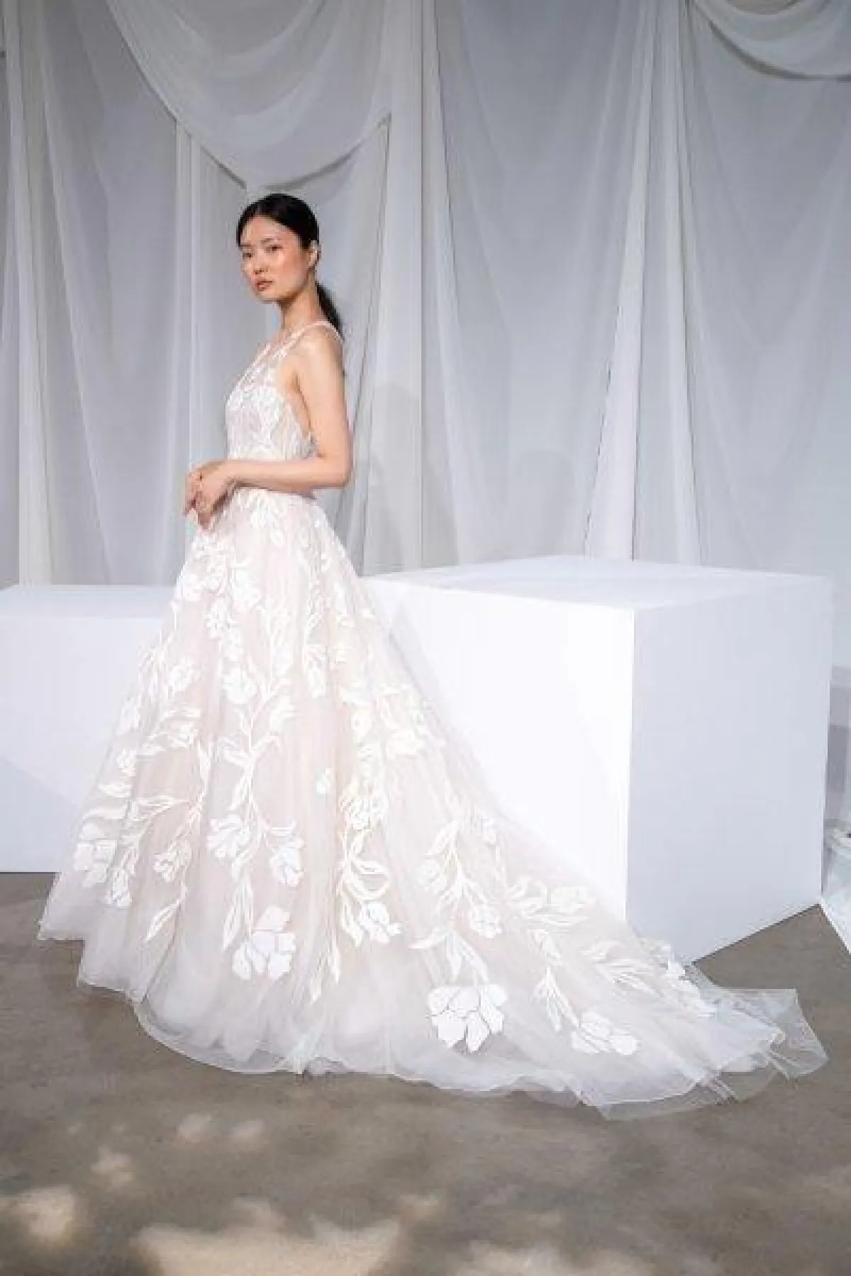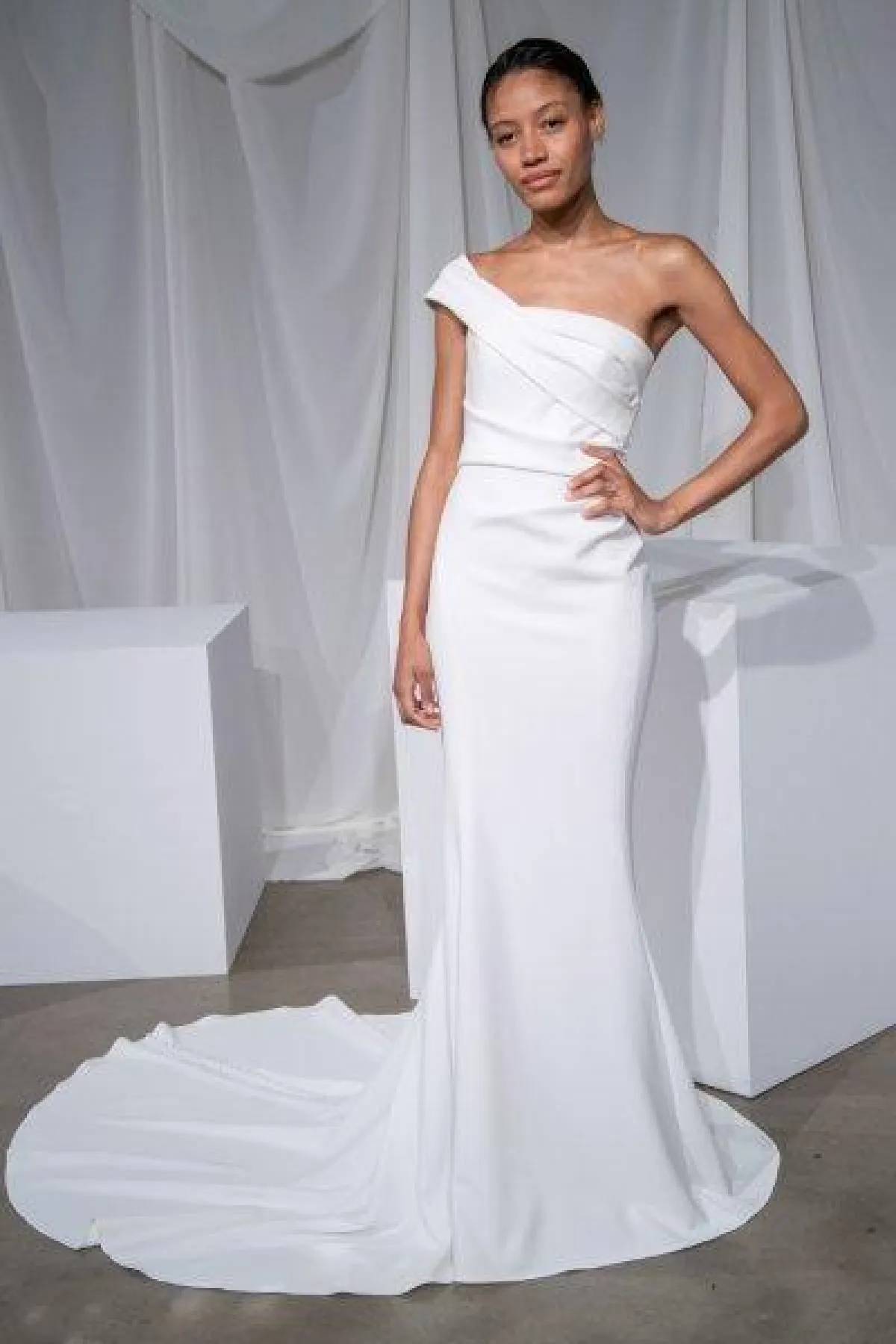 من ماركة Amsale، اخترنا لكِ فساتين زفاف ناعمة مع ذيل طويل، فقد غلبت القصّات العمودية والضيقة على التشكيلة.