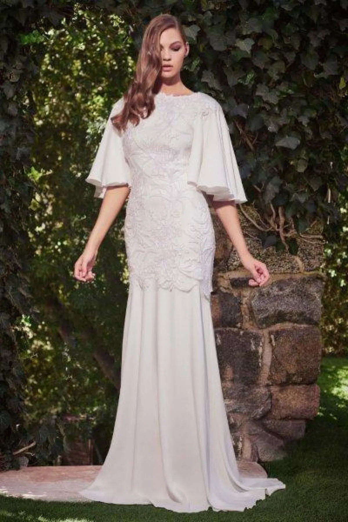 قدمت ماركة تاداشي شوجي فستان عصري بأكمام طويلة واسعة وبقصّة عمودية راقية مع ذيل طويل من الخلف.
