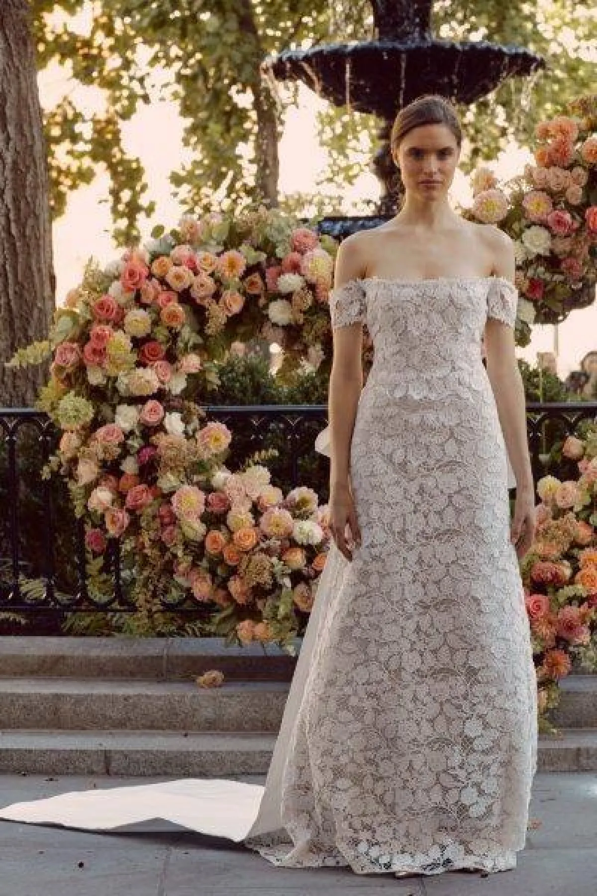 أحببنا فستان أوسكار دى لارنتا الدانتيل بالقصّة التي تبرز انحناءات القوام الممشوق مع الذيل الطويل الذي ينسدل على الأرض من الخلف.