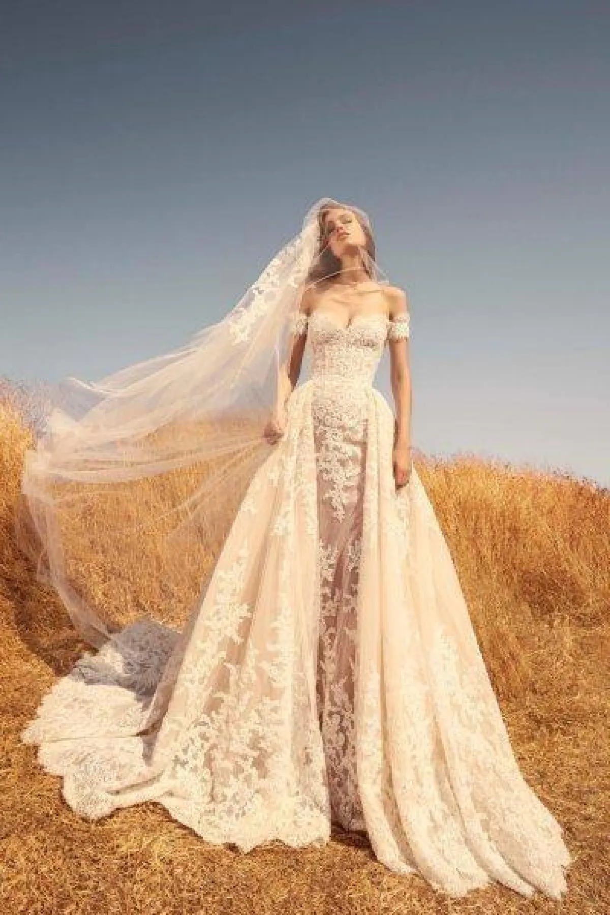 برزت الفساتين الضيقة والمنفوشة في تشكيلة Galia Lahav، مع ذيل طويل بقماش الستان أو التول.