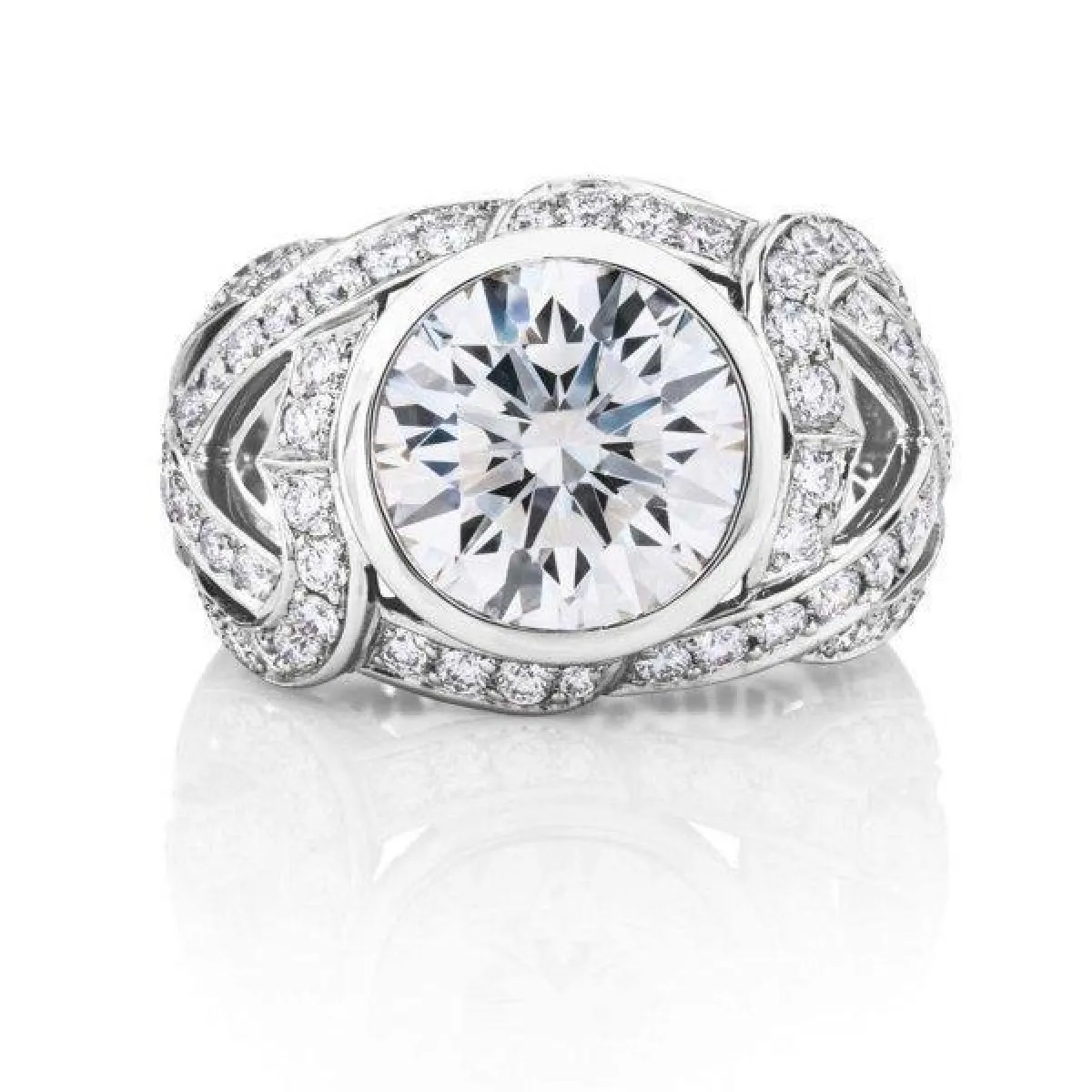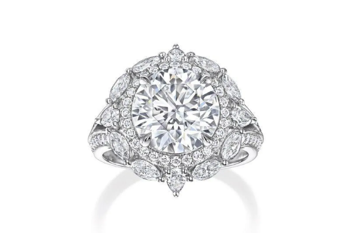 كذلك قدمت ماركة هاري وينستون خاتم خطوبة فخم يتوسطه فص ألماس دائري كبير وتحيطه فصوص الألماس الصغيرة بتصميم جذاب ولافت للأنظار.
