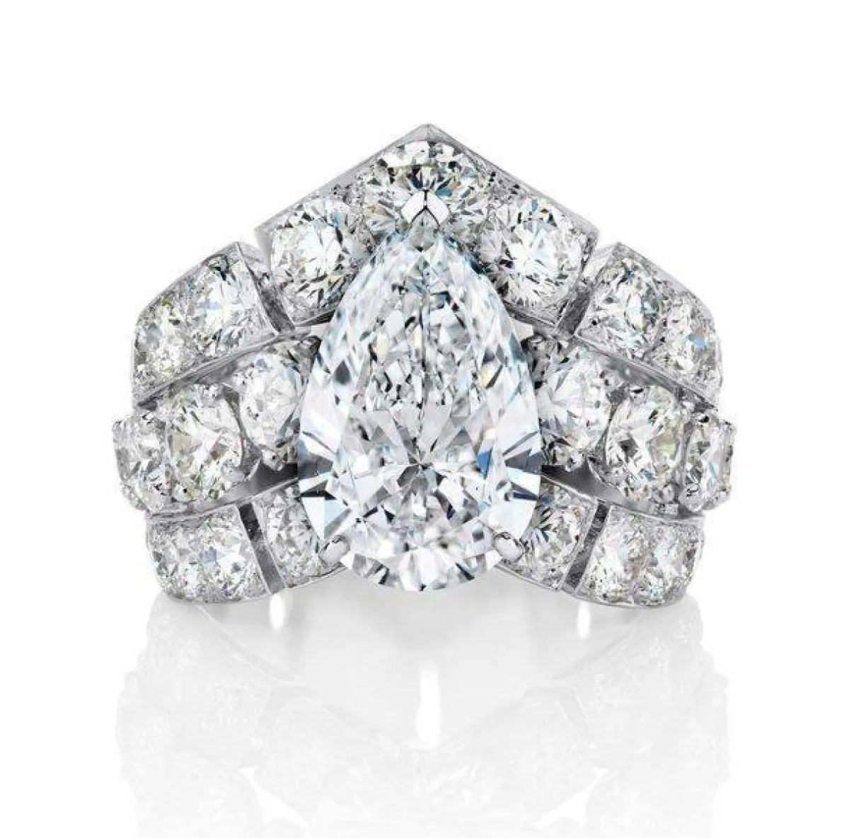 قدمت ماركة بوشيرون خاتم خطوبة بتصميم كبير ومرصع بالألماس، ويتسم الخاتم بتصميم الإجاصة بالذهب الأبيض.