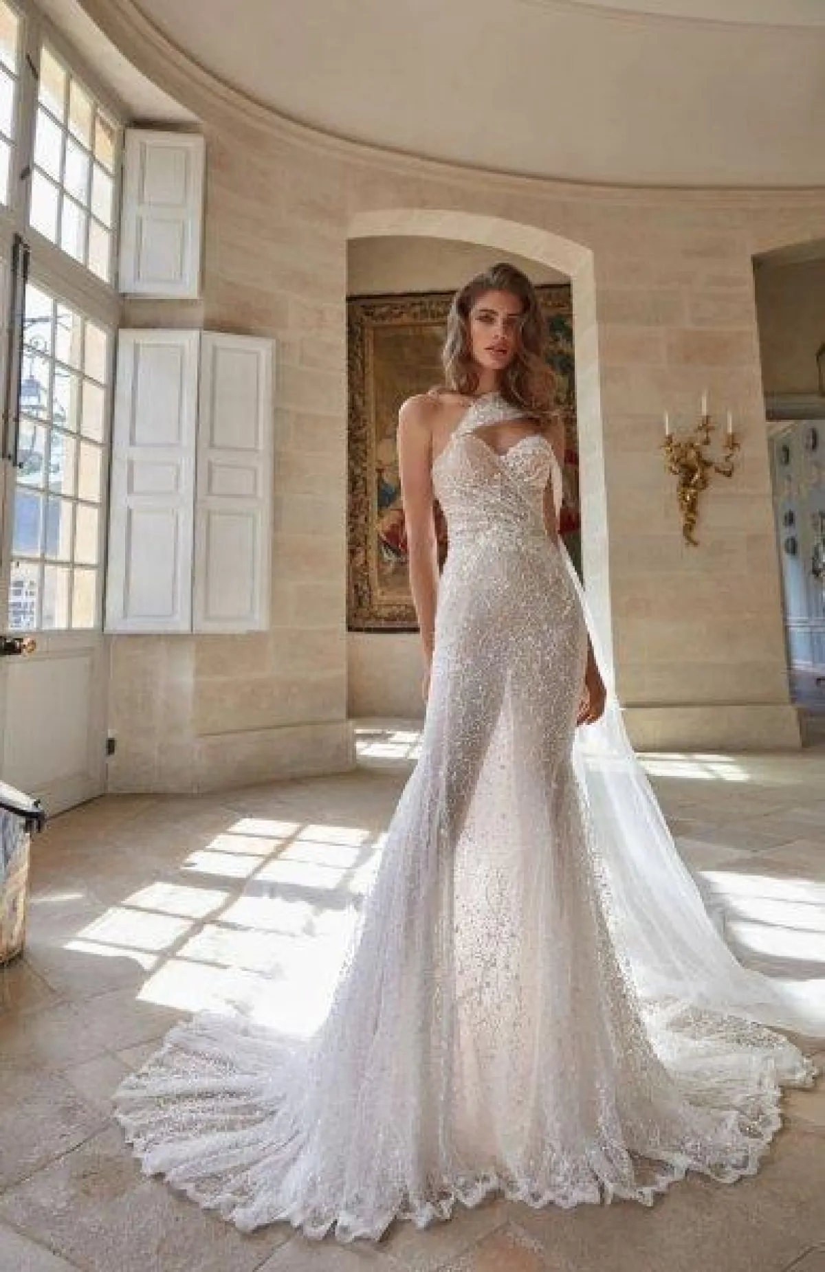 الفستان بقصّة ضيقة تتسع من أسفل ومرصع بتطريزات برّاقة مع وشاح طويل ينسدل على الأرض من الخلف.