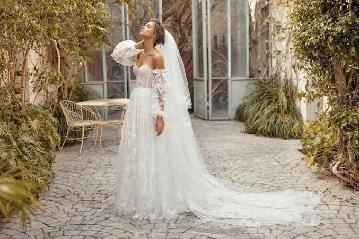 وقع اختيارنا على فستان زفاف A Line بقبّة V وأكمام الجرس المنفوخة.