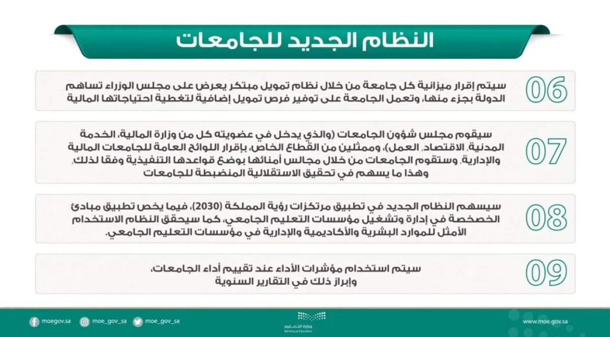 في حين، بيَّن طارق الأحمري، المتحدث باسم التعليم الجامعي في وزارة التعليم، أن مشروع النظام يتكوَّن من 14 فصلاً، ويشتمل على 58 مادة.