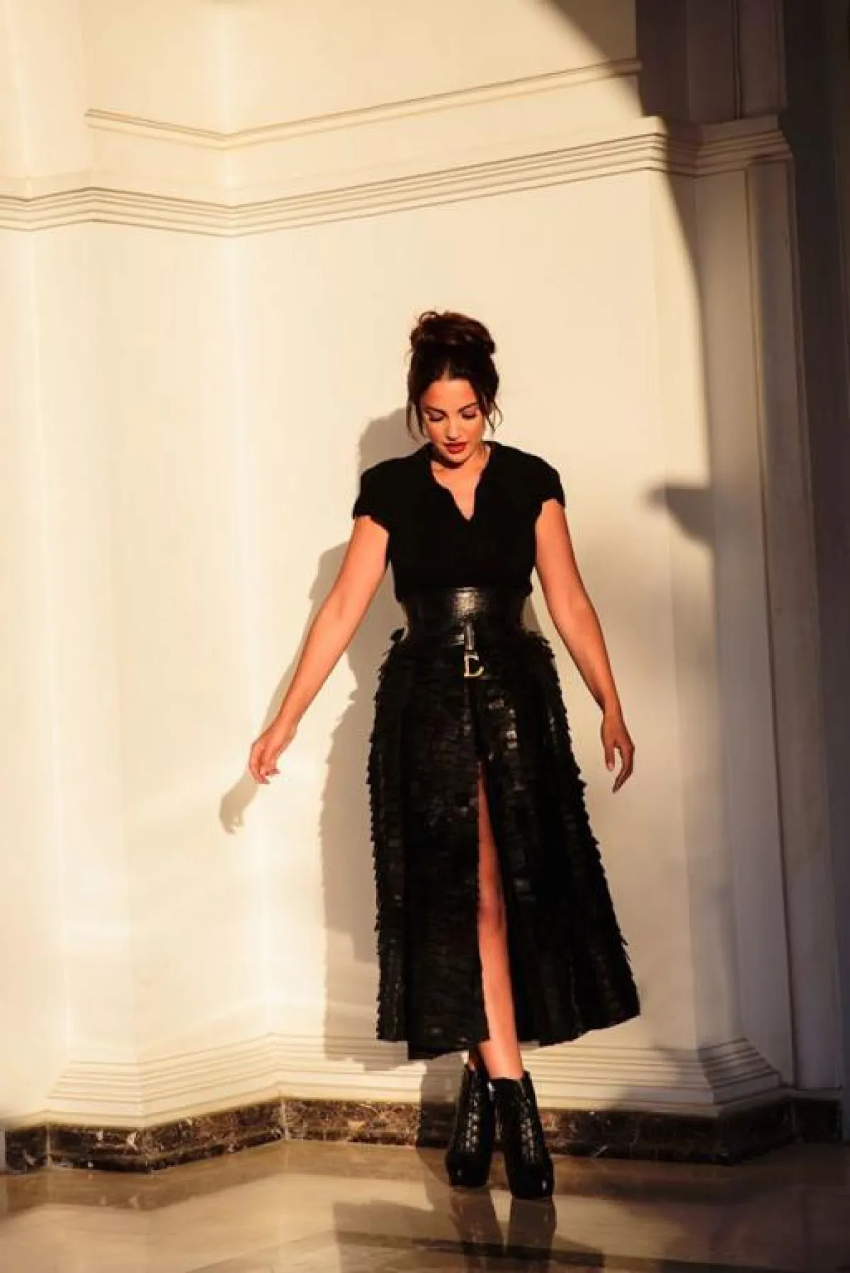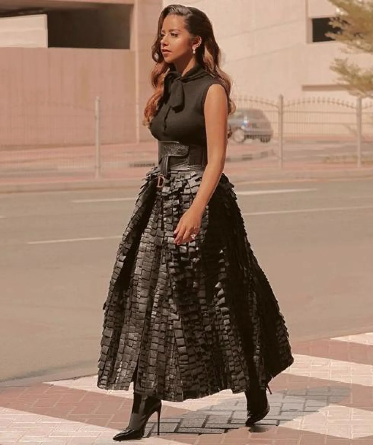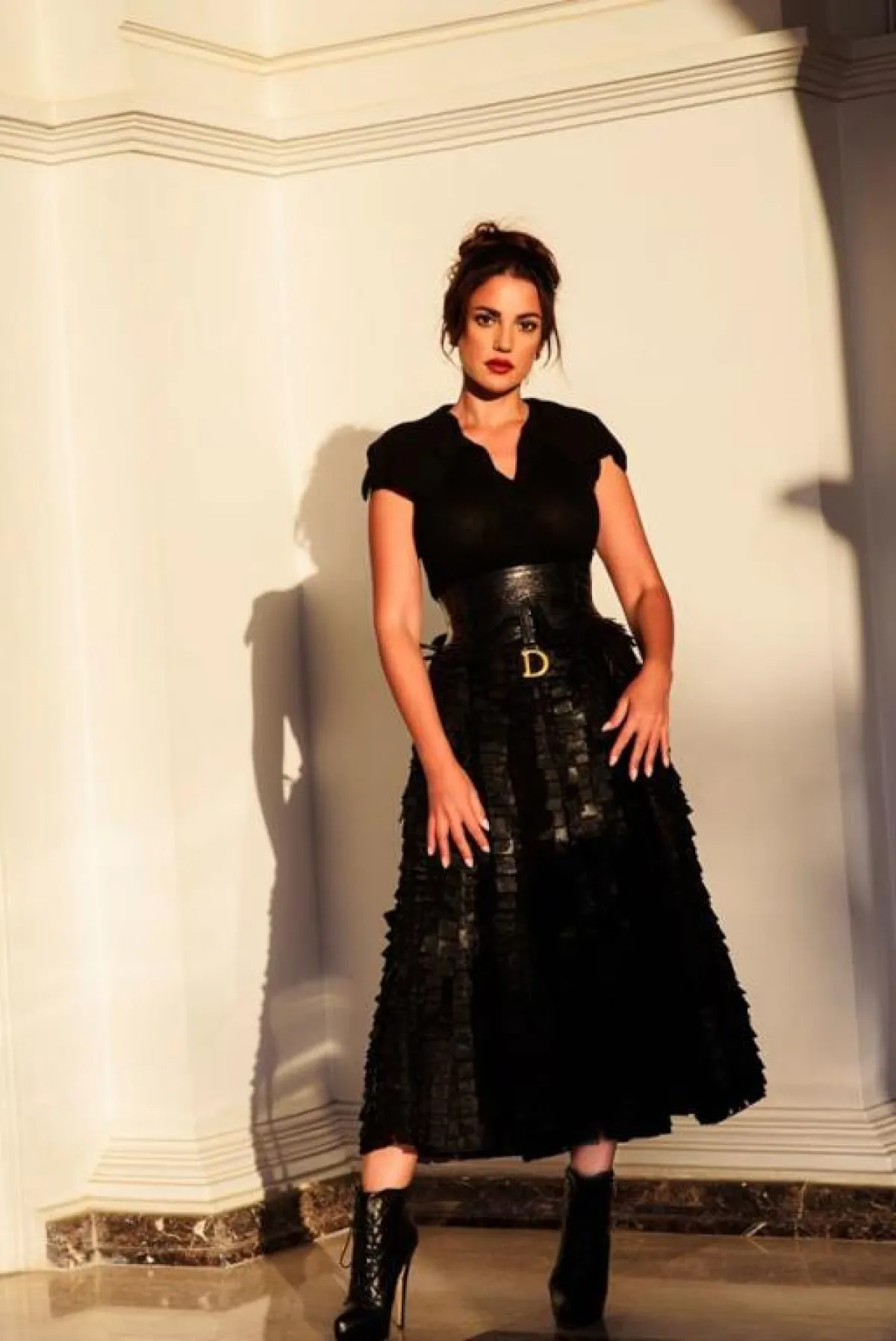 درة زروق كانت السباقة لاعتماد عدد من الاطلالات المميزة من ديور، منها هذا اللوك باللون الأسود والذي اختارت فيه تنورة ماكسي مصنوعة من طبقات ناعمة من الكشكش، نسقت معها قميصًا ناعمًا بأكمام قصيرة، وزينت اللوك بحزام عريض من الجلد على الخصر، وحذاءً بكعب عالٍ مزين بالأربطة.