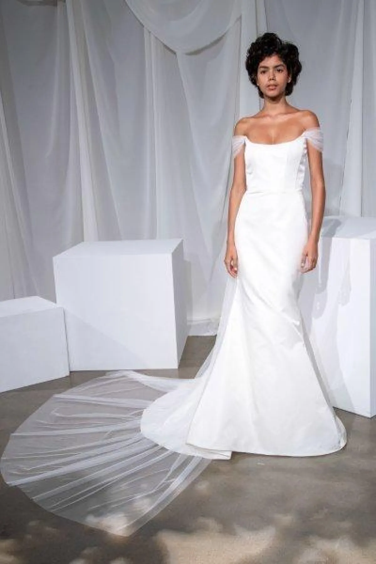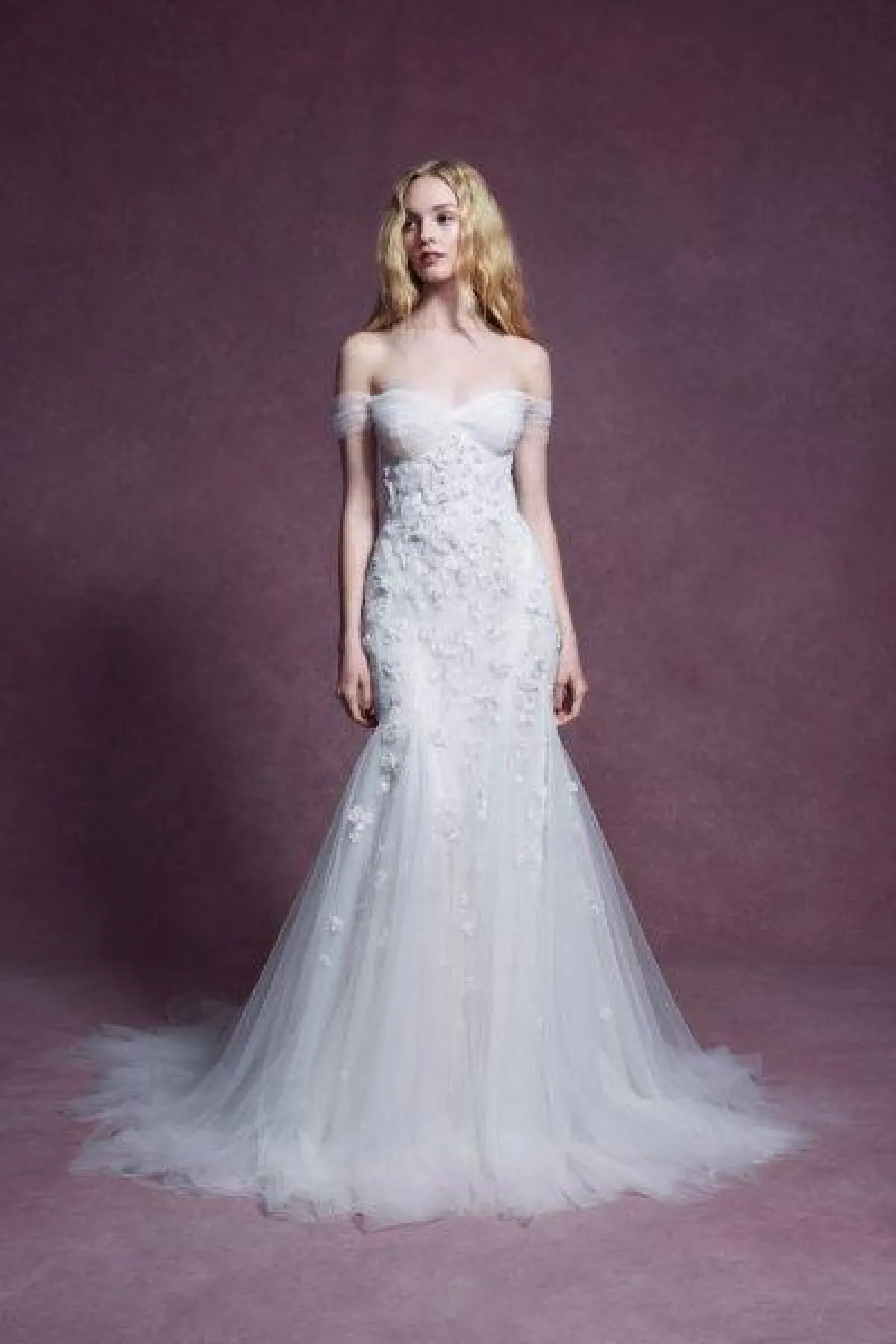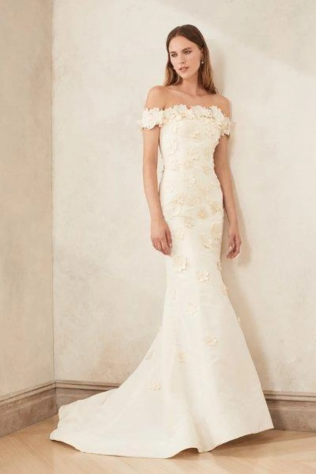 الفستان بذيل طويل ينسدل على الأرض، وبقصّة كاشفة للأكتاف Off Shoulder.