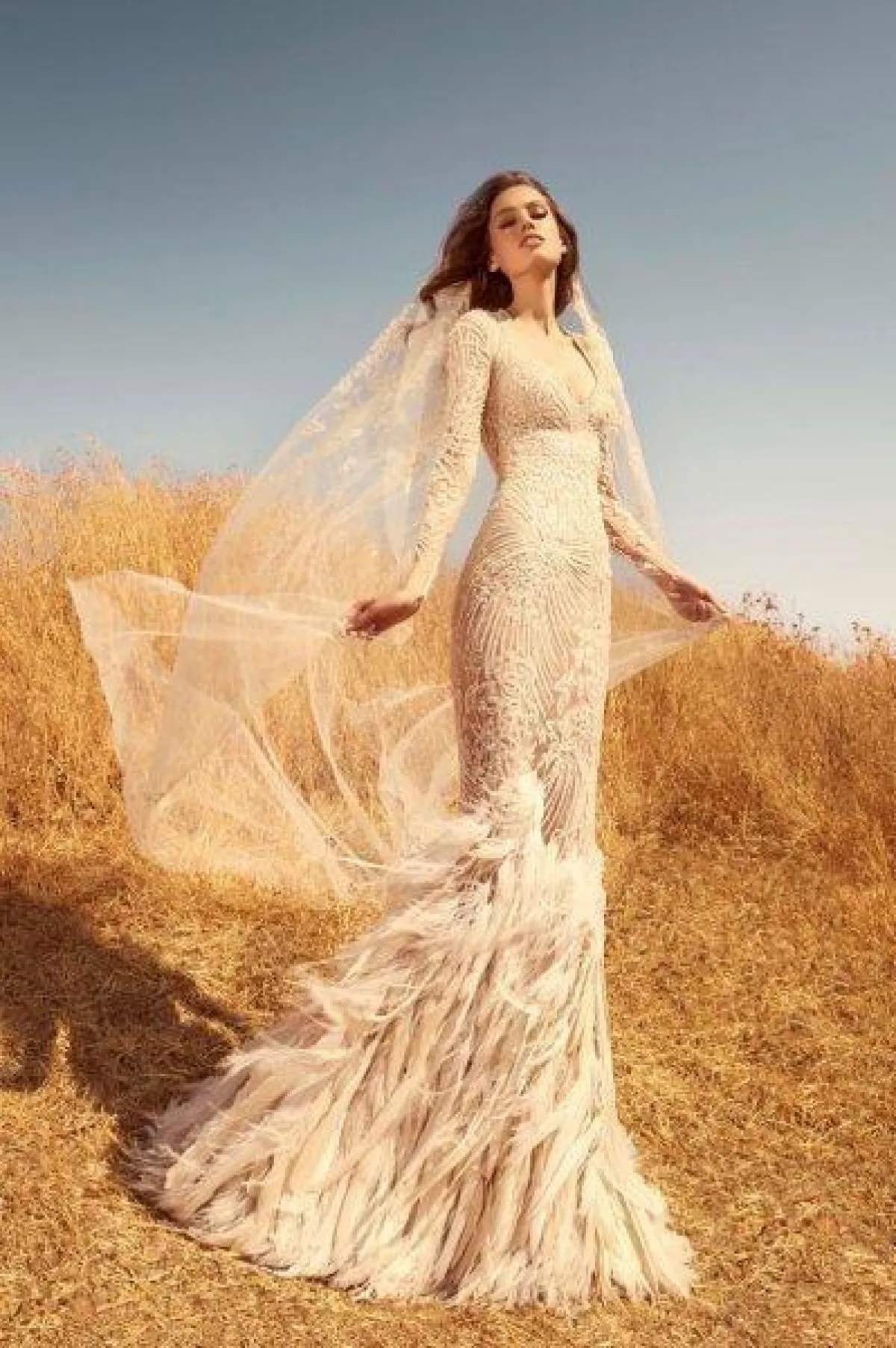 تزين الفستان بلمسات الريش لمزيد من السحر، مع أكمام طويلة وقبّة V تمنح العروس طولاً ورشاقة.