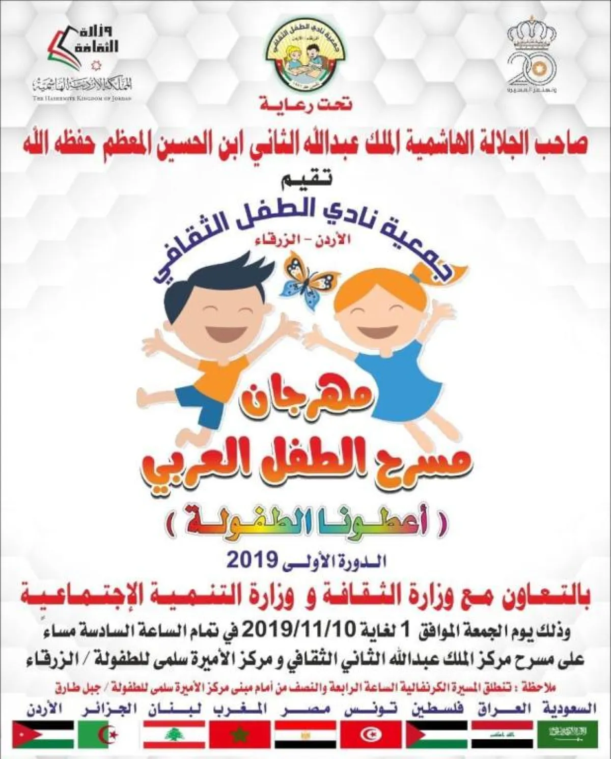 ويحظى المهرجان برعاية الملك عبدالله بن الحسين، ملك المملكة الأردنية، وتشارك فيه ثماني دول، هي: الأردن، السعودية، فلسطين، العراق، تونس، الجزائر، مصر ولبنان.