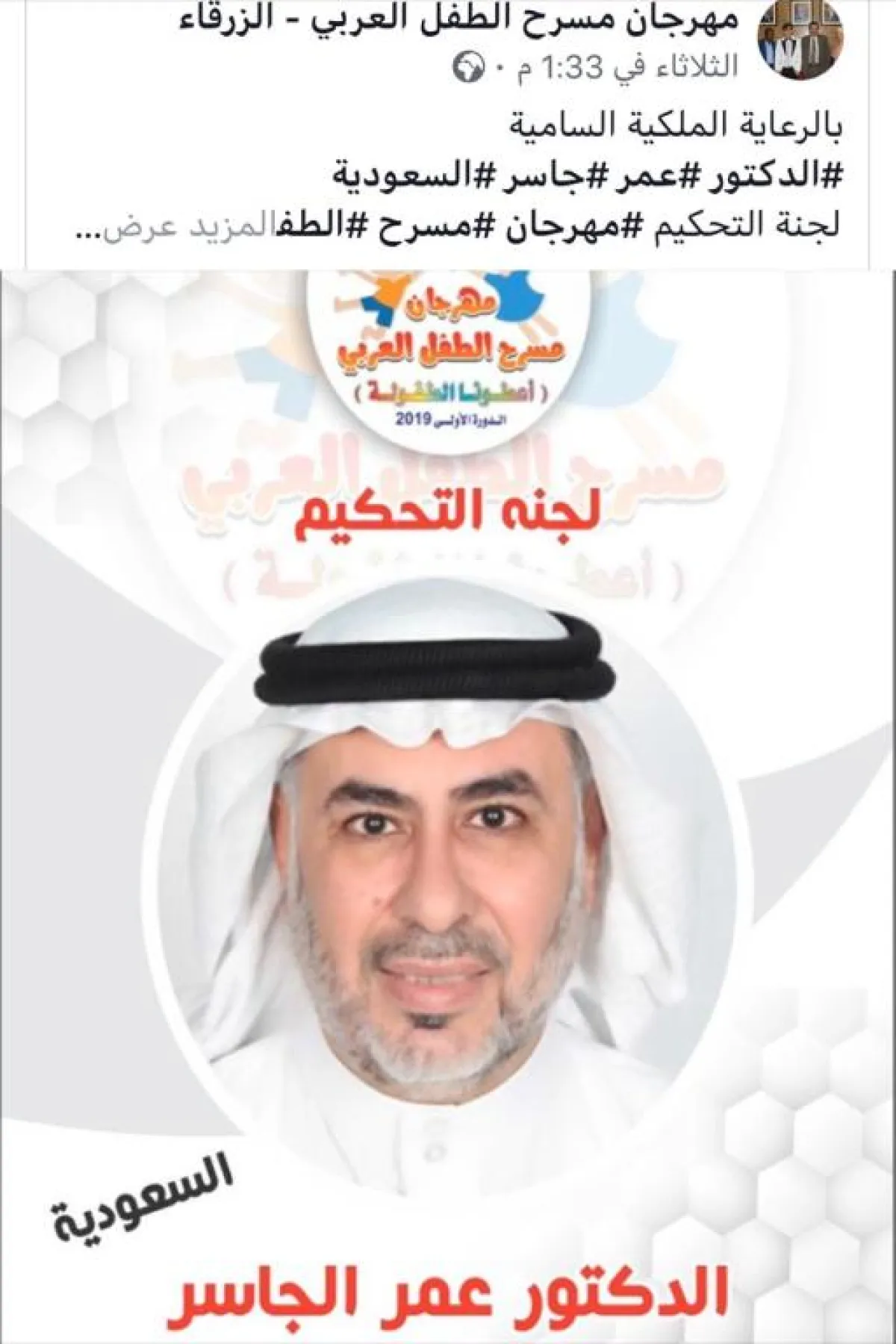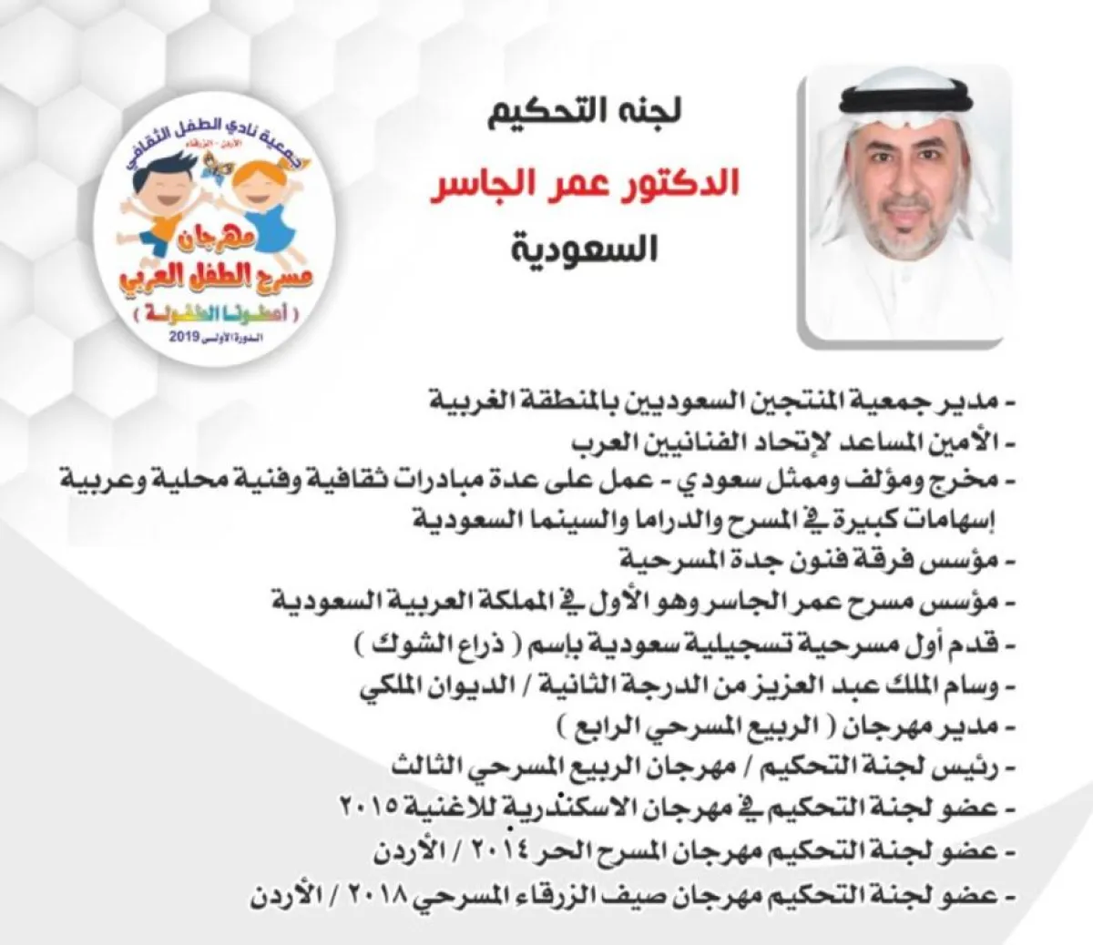 اختير المخرج والممثل السعودي الدكتور عمر الجاسر للمشاركة في لجنة تحكيم مهرجان الطفل العربي الأول، الذي يبدأ فعالياته غداً في مدينة الزرقاء الأردنية تحت عنوان "أعطونا الطفولة"، بتنظيمٍ من جمعية نادي الطفل الثقافي في الزرقاء، وتحت مظلة وزارة الثقافة الأردنية.