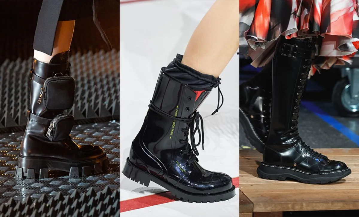 أحذية المطر بالجلد الأسود هي الرابح الأكبر من تصاميم Balenciaga، كما Acne Studios اللذان أطلا أحذية المطر ذات الكعب العالي باللون البنيّ أو الرماديّ أو الأزرق لتناسب مع أية ملابس. هذه الأحذية العالية مثالية للطقس الممطر، وهي طريقة رائعة لإضفاء لمسة أنيقة على المظهر الخارجي. رأينا أيضًا أحذية مطر تقليدية في Stella McCartney و Christian Dior.