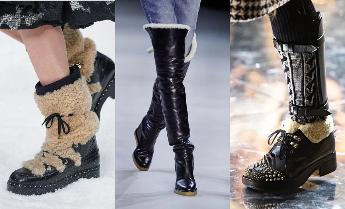 البوت الجلد لا يفقد موضته أبداً ويبقى ترند كل شتاء. الجلد المقطّع يعود أيضاً هذا العام ويبدو الأكثر أناقة بين البقية خاصة بلونه البوردو. هذا ويعود البوت الجلد ذات الساق العالي، واللافت أنّ الموضة هذا العام هي البوت الطويل فوق الجينز سواء مع أرجل ضيقة أو واسعة. البوت الجلدي البنيّ من أجمل الموديلات التي بدورها تعيد حقبة السبعينات والثمانينات والتسعينات كما جاء في تصاميم Celine وAlexander McQueen و Prada و Isabel Marant الذين جعلوا من Punk boots موضة الأحذية هذا العام.
