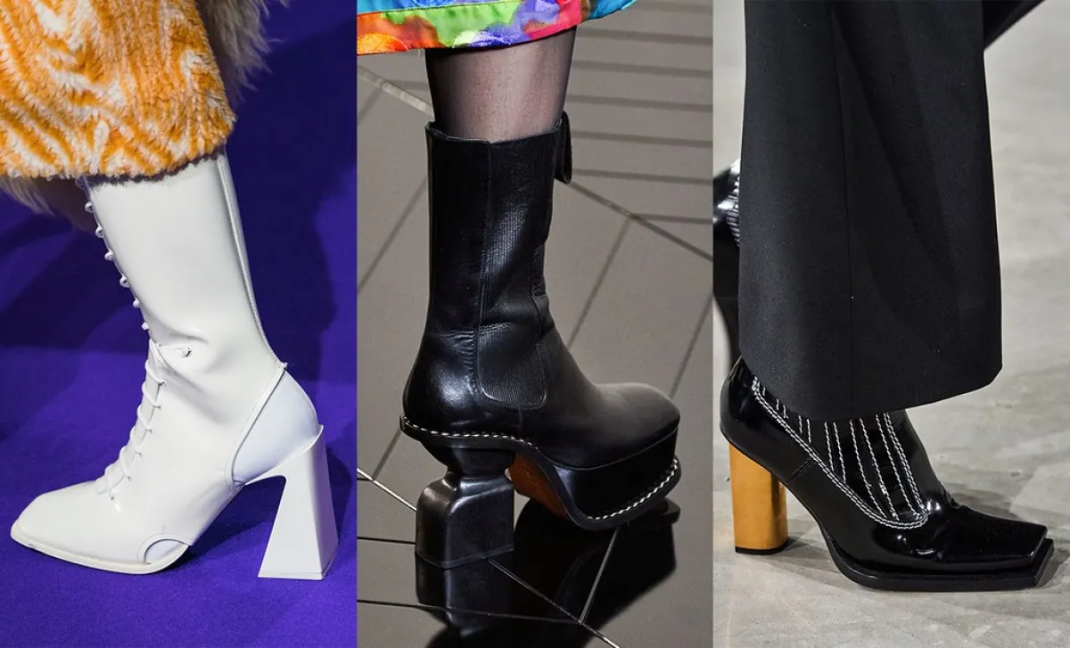 كعوب الأحذية بأشكال هندسية والموضة هي الجلد واللميّع. الصور تحتوي تصاميم Kenzo, Loewe, Proenza Schouler