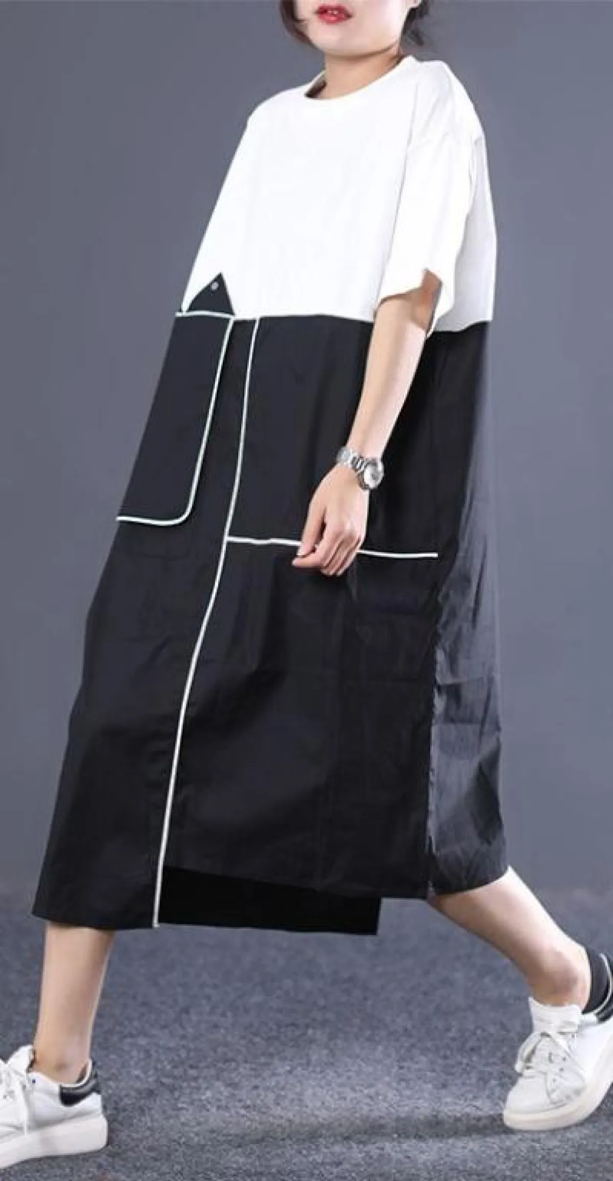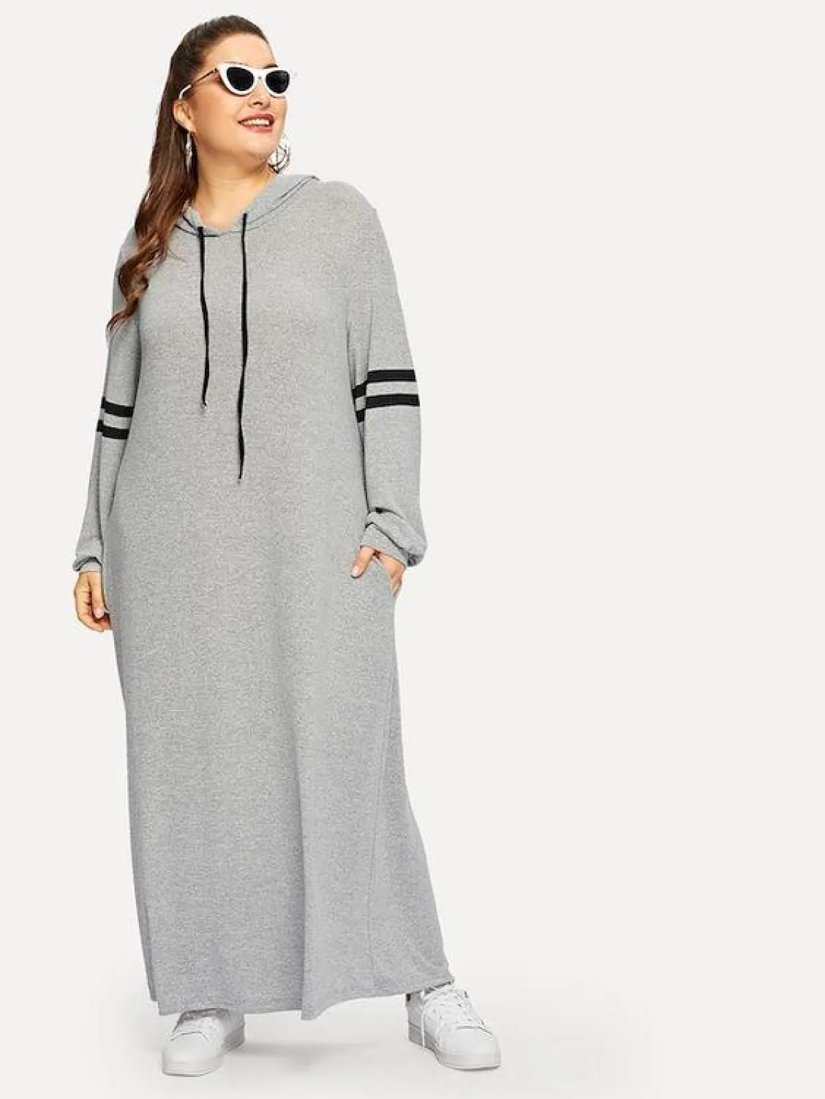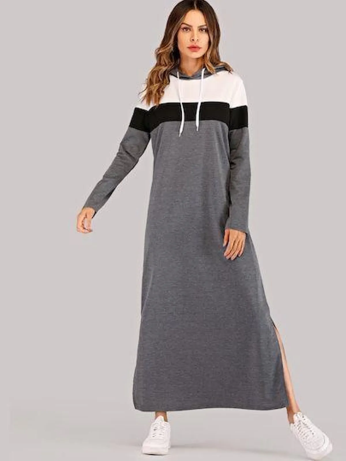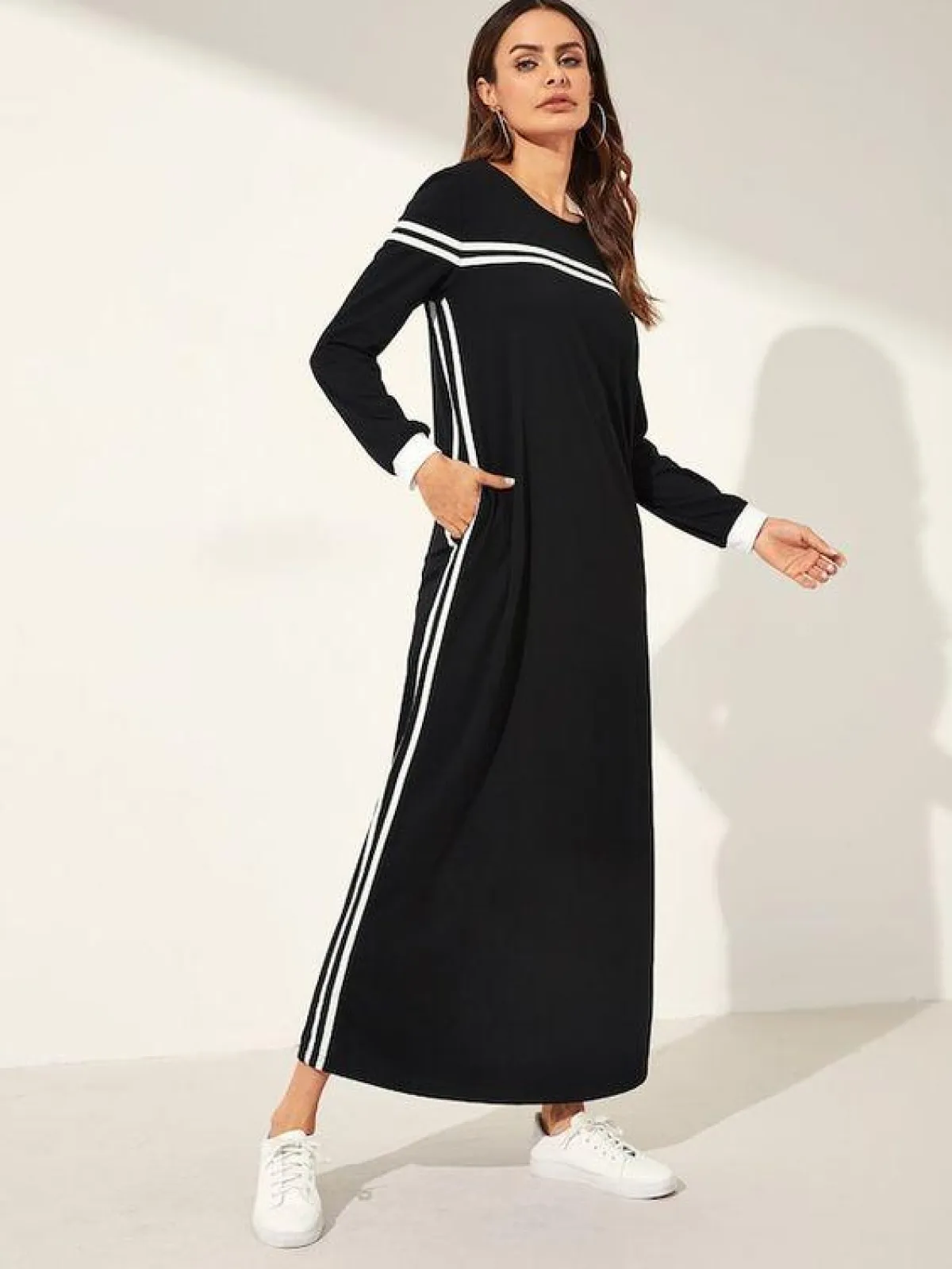 اللونان الأبيض والأسود من أكثر الدرجات التي نشاهدها دائمًا بالملابس الرياضية، وتباعًا وجدناها بموديلات العبايات الرياضية، كهذه العبايه السوداء مع الخطوط البيضاء الجانبية من shein، وأفضل ما يمكن أن تعتمدي معها السنيكرز الأبيض أو الملون، لتكسري حدة الدرجتين المحايدتين، وكذلك اعتمدي شنطة ملونة لا سيما حقيبة الخصر.