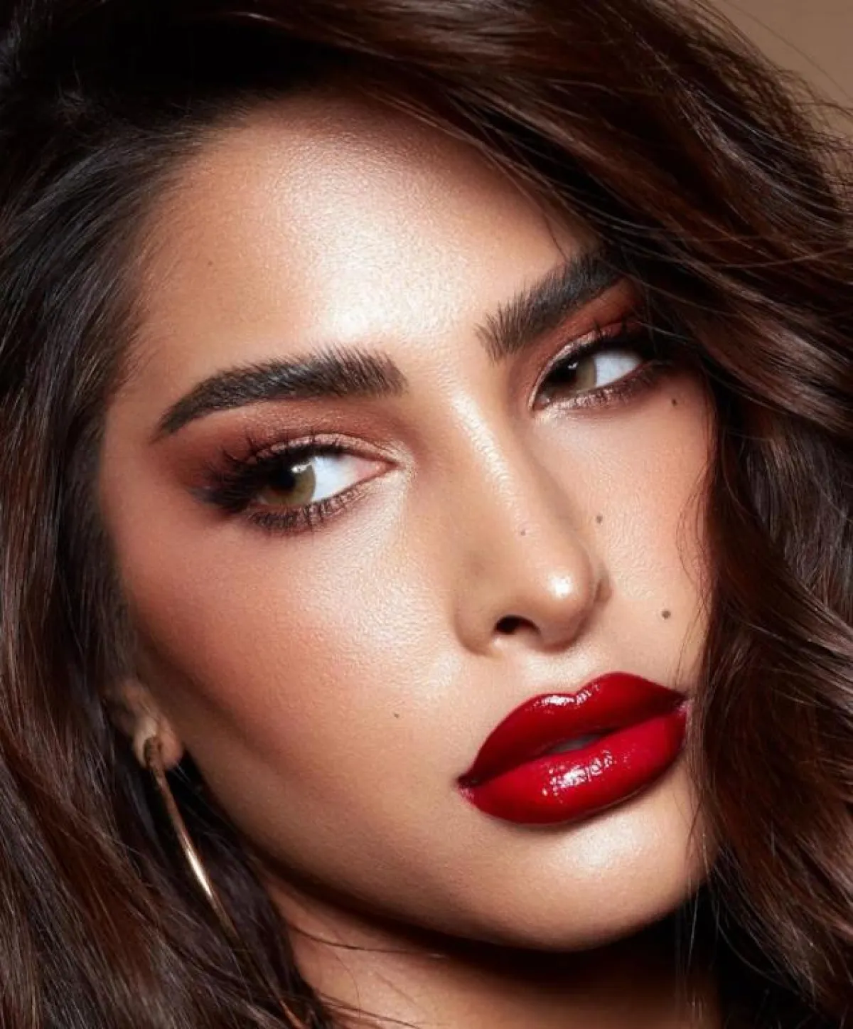 عن المكياج الأحمر، فقد تزينت باطلالة حادة رسمت بها عينيها بالكحل الأسود من الداخل والخارج، ووضعت درجة داكنة من اللون الأحمر في كسرة العين وأعلاها، ودرجة لامعة من الأحمر في الجفنين، ووضعت بلاشر أحمر وطلاء شفتين بدرجة داكنة جدًّا من الأحمر، وتألقت في اطلالة أنثوية بـ أحمر الشفاه الأحمر، واستخدمت لجمال عينيها اللون البني الترابي والعدسات العسلية.