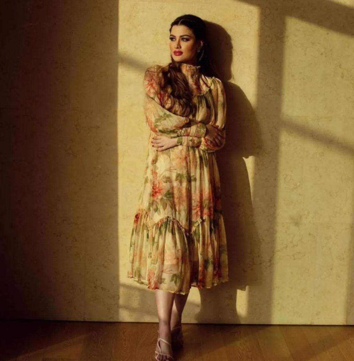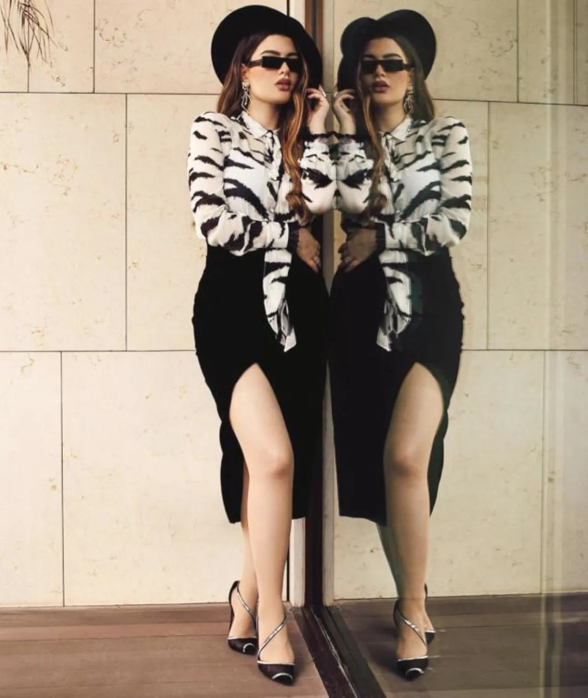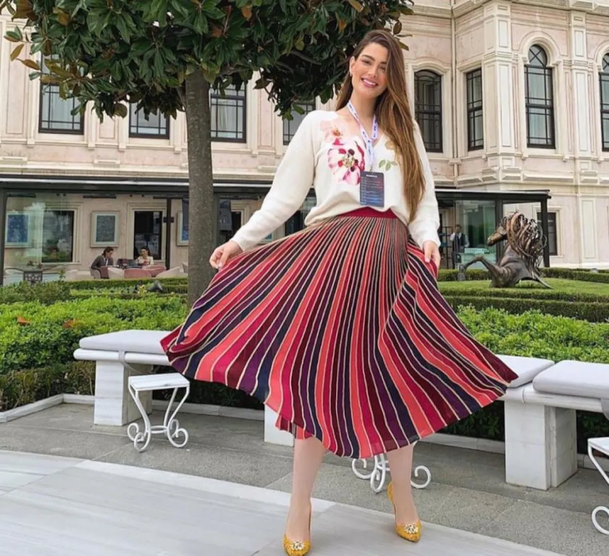 كما ظهرت بجمبسوت بني بطبعات نمرية أضاف لها الكثير من الأنوثة، وتزينت ببنطال وبلوزة باللون الزهري تكسوهما الزهور الذهبية الضخمة لخيار عصري، وأطلَّت بتنورة سوداء منفوشة بكسرات وقميص أسود مزين من الياقة بالخرز الفضي، وتألقت باطلالة أنيقة مفعمة بالألوان بتنورة مخططة باللون الأحمر والزهري بتدرجاته، والكحلي والبنفسجي مع بلوزة سكرية بزهور.