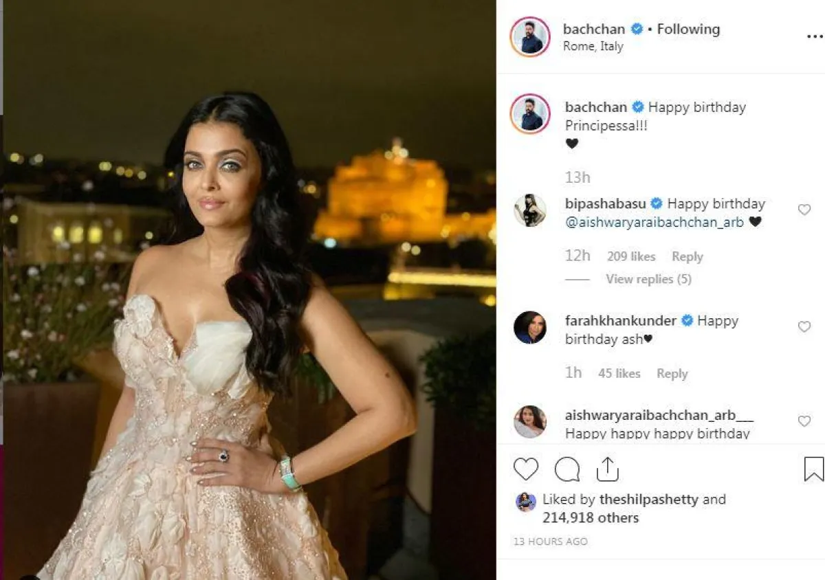 أما أبهيشيك باتشان زوج أيشواريا، فقام بنشر صورة لها عبر حسابه الخاص في انستقرام معلقاً عليها بالقول:" كل عام وانت بخير أميرتي."