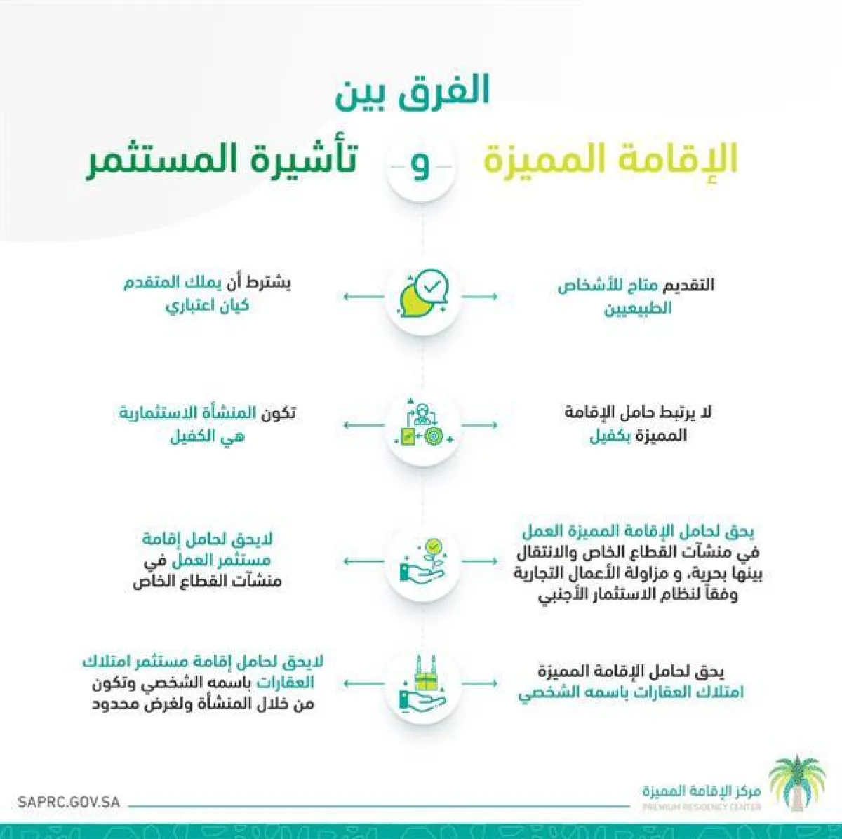 كشف مركز الإقامة المميزة عبر موقعه الإلكتروني الرسمي، عن الفرق بين "الإقامة المميزة و"تأشيرة المستثمر"، وهل يسمح لأي منهما التملك ومزاولة العمل التجاري أو العمل القطاع الخاص؟.