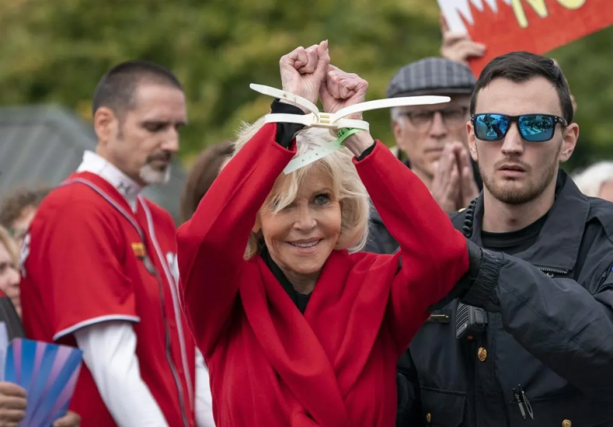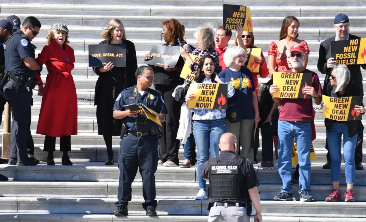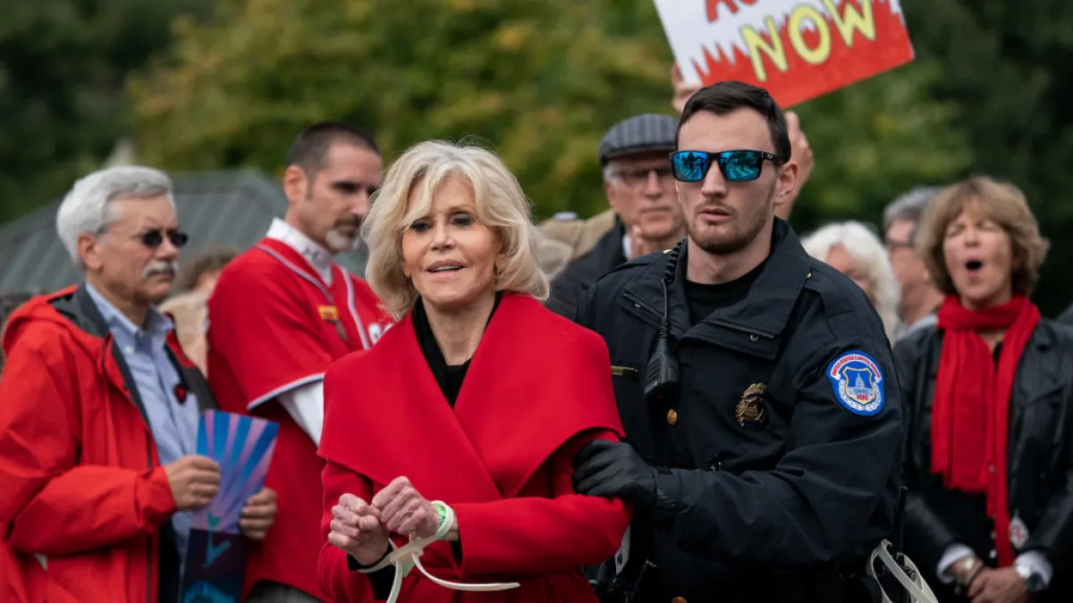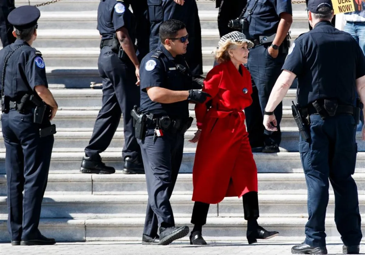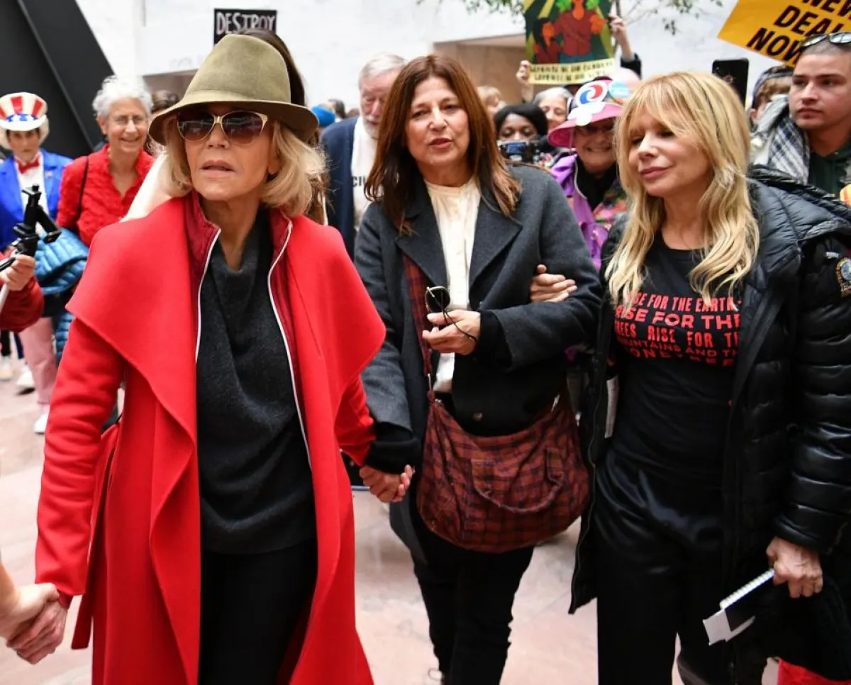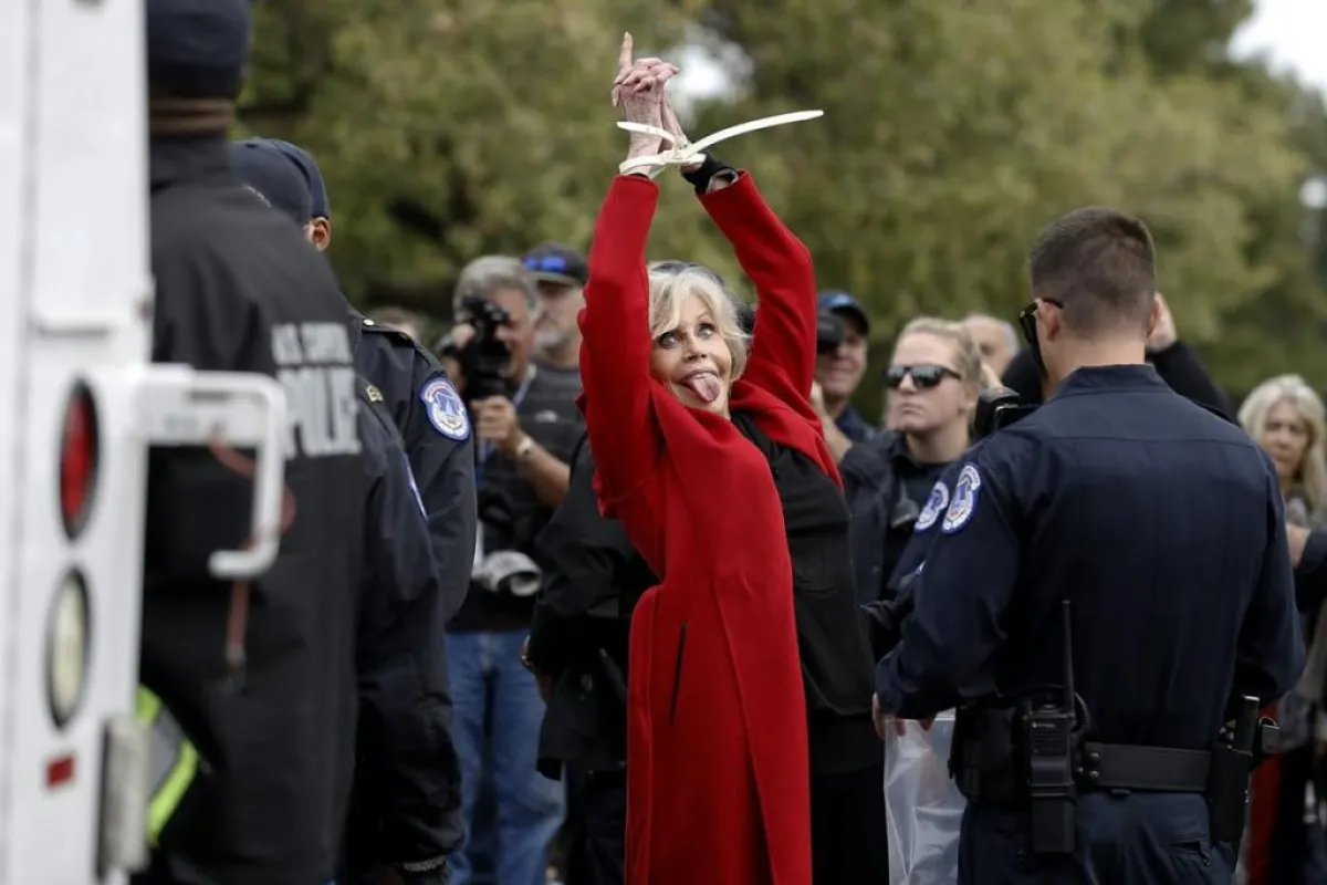 وقبيل اعتقال النجمة الأمريكية، كانت جين فوندا برفقة ما يزيد عن الـ30 ناشطاً بيئياً يجلسون في بهو أحد المباني الإدارية التابعة للكونغرس، الذي يمنع القانون الأمريكي التظاهر فيه. وكان برفقتها أيضاً عدد من النجوم والمشاهير الآخرين المشاركين في التظاهرة، من بينهم النجمتنين روزانا أركيت وكاثرين كينر. وكانوا جميعهم يرددون أغاني وهتافات تؤكد على ضرورة التصدي الجاد لمشكلة التغير المناخي العالمي. ومن المتوقع أن تحاكم فوندا بتهمة الإخلال بالنظام العام، التي قد تؤدي إلى سجنها لعدة أيام بسبب تكرار ما تفعله خلال التظاهرات.