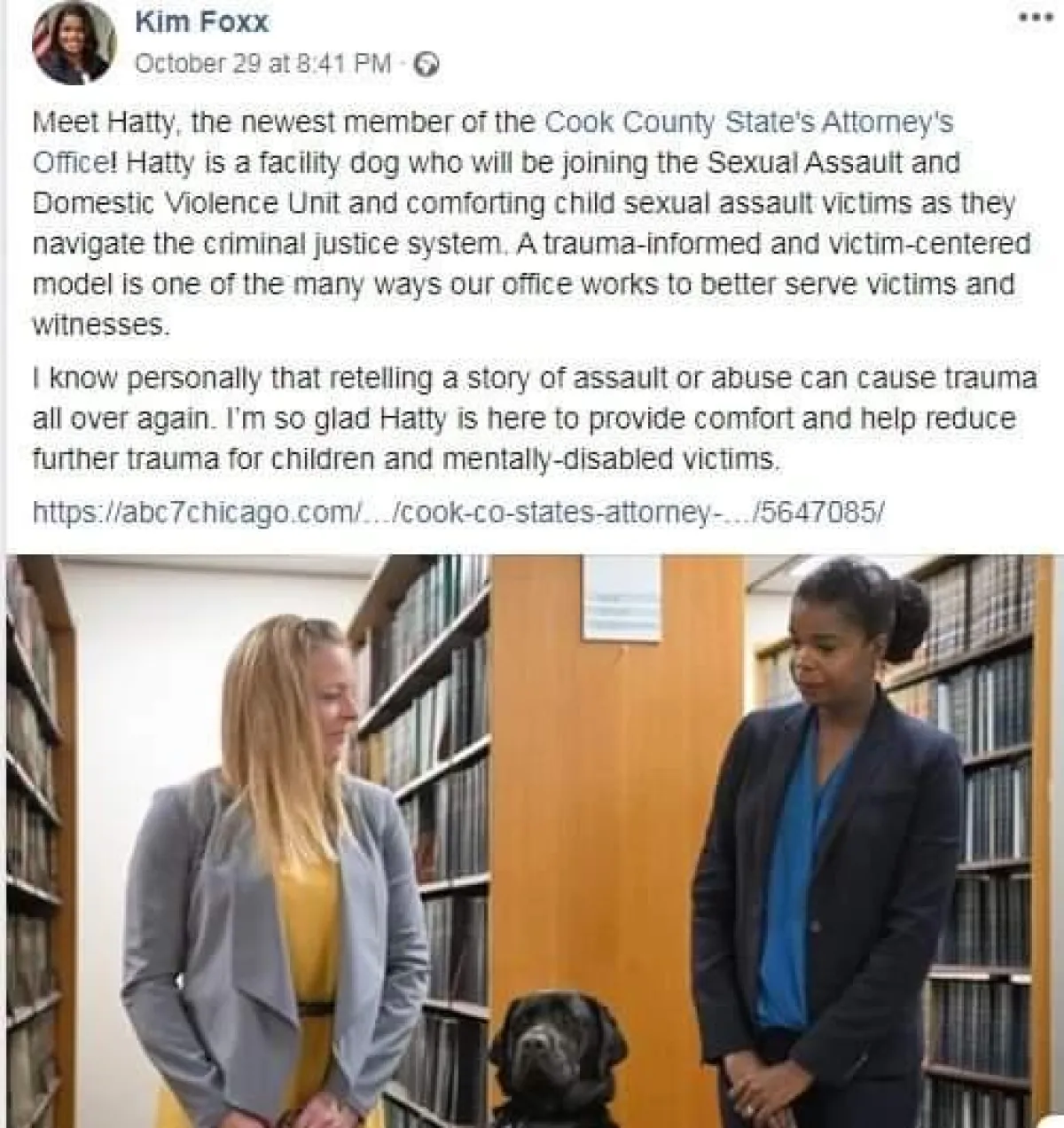 فلقد اعتمدت الكلبة هاتي، وهي من فصيلة «لابرادور»، وتبلغ من العمر عامين، بشكل رسمي كمحامية من قبل النائب العام لولاية شيكاغو الأمريكية للتخفيف من معاناة الأطفال والبالغين الذين يعانون من صدمة نفسية ومشكلات عقلية.