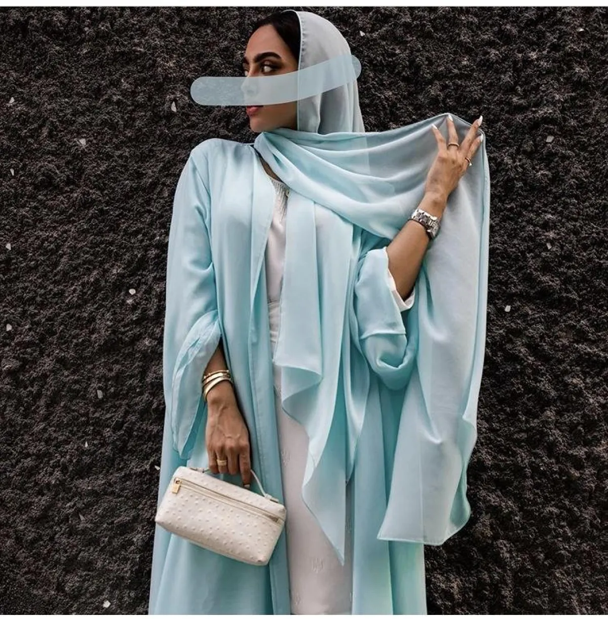 كما قلنا، إن الفاشينيستا جوري تعتمد على أسلوب متنوع باختيار تصاميم العبايات، فما بين التصاميم الفخمة كذلك، قد نجدها تعتمد عبايات مخملية، كهذا التصميم باللون البيبي بلو للعباية الشيفون، لإطلالة نهارية بسيطة ومختلفة.