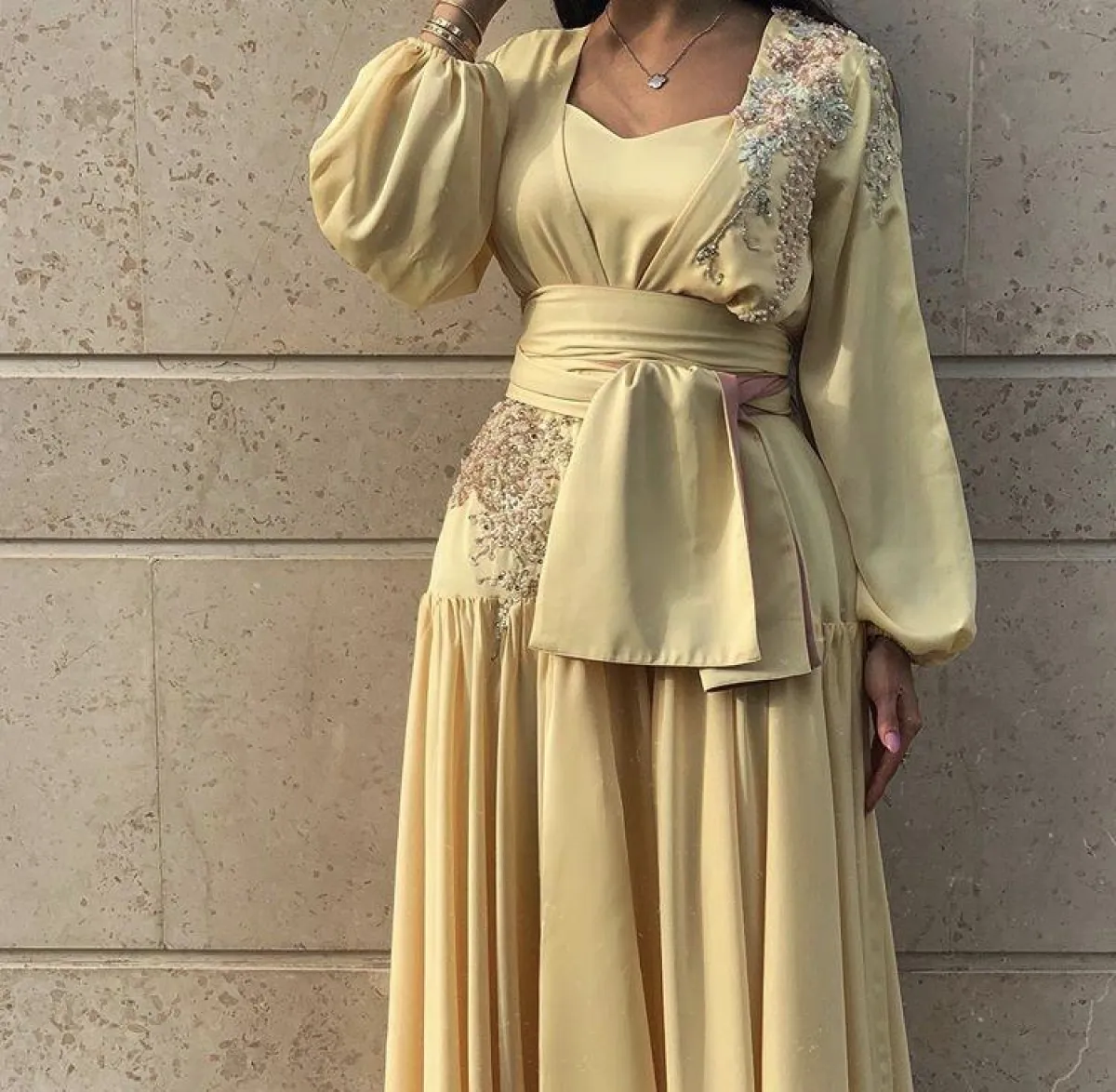 لفتنا كذلك العباية باللون الأصفر الباهت المطرزة، لإطلالة كلاسيكية، مع الكعب العالي والأكمام الواسعة، تناسب الحفلات والمناسبات، مستوحاة من ستايل الفساتين السواريه، ولكن بأسلوب محتشم يناسب المحجبات.